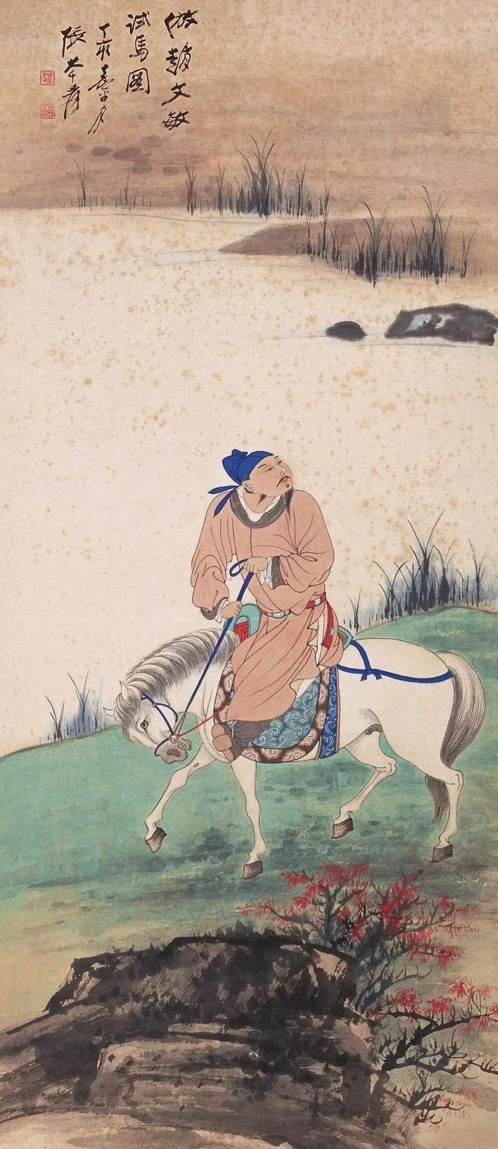 大千得此四十二大条后,即偕祖韩之五弟祖元飞至北平,因其时傅仪从吉林逃出时,所藏古画、所携古物悉为苏军所劫留,流散北方至多,大千携款去收购也。一月后即回上海了。祖元告余云,大千以廿大条收购了南唐顾闳中所绘《韩熙载夜宴图》一长卷,为当时顾闳中奉李后主之命偷看宰相韩熙载在府召伎及幸臣等夜宴歌乐之景况者。图如今之连环画,接写五段之情状者云。又以十八条共得三卷子,一钱舜举《杨妃上马图》、一燕文贵《山水》、一宋人《百马图》,一月之间,所存四条而已。是时大千应众友之请出示《夜宴图》。过三四日,大千独留稚柳及余二人嘱最后俟群宾散后再走云云。至夜十时后,又出一《夜宴图》给稚柳赏鉴矣,笑曰:前出示者乃副本也,此方为真迹也。余外行也,觉二卷甚相似而已。后大千告余云:伪者少了一小段,真者隔水绫上多一段年羹尧亲笔题跋。余观后,始知年款已挖去,只下存一印尚能看出为“双峰”朱文印二字,年字双峰也,一笔柳公权体。据考,此卷初为年藏,年赐死后,抄归大内,此款挖去者也。(此卷在解放后由徐森玉之子伯郊携归中国,由故宫博物院以四万美金收购矣。闻当时有二三件,余二件未详了。)