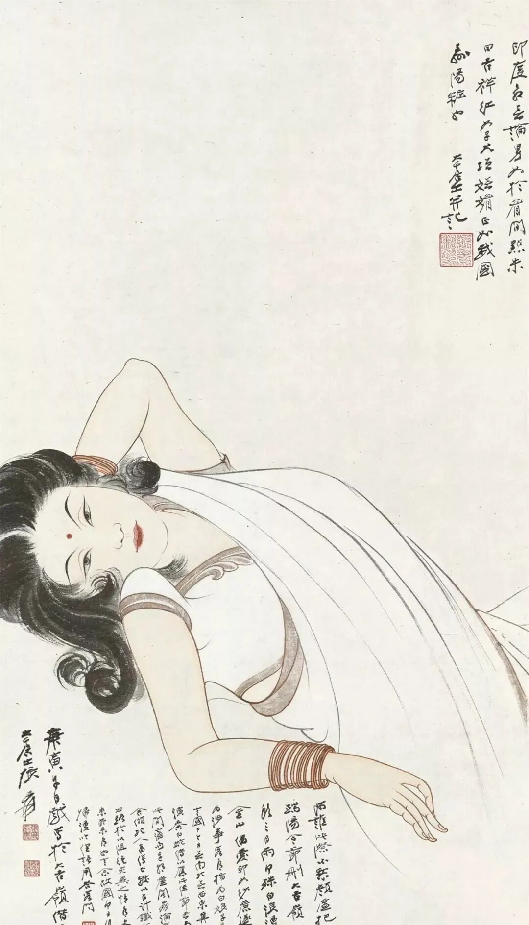 某晚大千谓余曰:某某,这三年来你为吾刻印超过一百方,且多象牙章,你不肯取吾分文,吾亦只为你画二页扇面,一张花鸟册页而已,你比介堪,人格大不相同矣,吾回成都后,必将吾所有技艺、本领,分画在十二个大扇面上,山水、人物、花鸟、走兽,白描、金碧一一应有尽有,惟反面一定亦由吾一手包办的。惜是年秋日,一去国外从未归来,此诺成空矣。当时又谓余曰:吾将耗半月之力,先为你作一三尺立幅,你题目再难,吾必满你的意如何。余戏告之曰:一、要画工笔正面仕女;二、要半身的,露两手,十指交叉,手背向上,托住下颔;三、不要园林花卉作补景。余并坦白告之云:昔年一女友,余与之缠绵悱恻近四年,惟未及于乱,几坠于情网之中(陆小曼尝见之,谓余曰:生平所见绝色佳人,一、梁思成夫人、林宗孟女儿;二、即斯人焉,吴湖帆亦惊为天人,几乎被牵入闹笑话),此形仪斯人之小影也,恨未索回珍藏,故录写此景耳。大千欣然应命,写一半身者,凭窗口向远凝视,双手手背托颔也,衣一淡蓝色衫,至平常,但双袖为古锦阔边,花纹穷极工细,背后补景,为六扇朱漆屏风,只露三面,屏面画白玉嵌的荷花数朵,翡翠嵌的大荷叶,屏架上端紫檀雕花,亦穷极工细,荷花、荷叶,表现出是嵌玉、翠的,写单款年月临顾闳中笔数字而已。大千笑谓余曰:吾生平作画从不用大烧柳条先勾的,这画双手十指纤纤,相叉向下,十分难表现真切之状,吾只能命女学坐在对面,做了模特儿,吾用柳条勾了才画成的,你这题目真是恶作剧也。次日命陈德馨私自来告,有某君愿以二大条购之,故特写单款,不妨卖去,有机会尽可画也云云。余未允,即日付装池,配红木镜框悬之书斋多年。三反五反时,余刻印几中断,故不得已由名伶王琴生携去卖于某剧院老板,送来了黄金六两,余即变成了烟土,真应了一句文言,悉化烟云矣。
