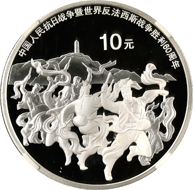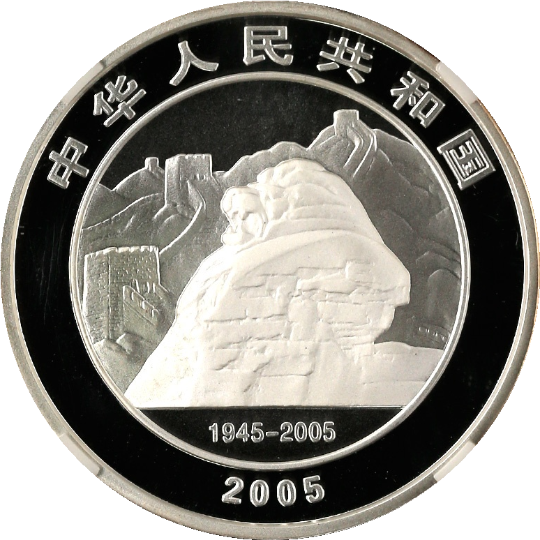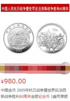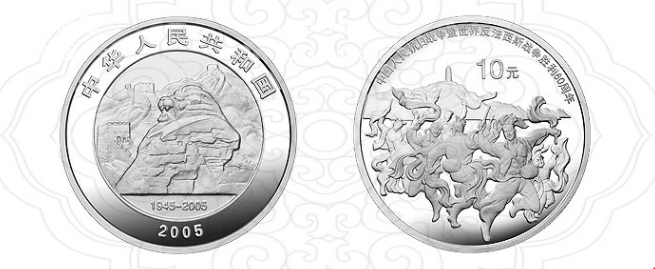 1945年9月2日,日本向盟军投降仪式在东京湾密苏里号战列舰上举行。在包括中国在内的9个受降国代表注视下,日本在投降书上签字。这是中国近代以来反侵略历史上的第一次全面胜利,也为世界反法西斯战争的胜利做出了巨大贡献。之后每年的9月3日,被确定为中国人民抗日战争胜利纪念日。中国作为第二次世界大战最惨烈的战场之一,抗日战争是中国人记忆中最沉痛的一段历史。抗战胜利,浴火重生,让中华民族洗去百年屈辱,赢得了地位、自信和尊严,第一次以胜利者的姿态,在世界的东方昂首挺胸站了起来!这是中华民族命运的历史转折!这是值得世界铭记的伟大胜利!2005年,为了纪念这段历史,中国人民银行发行了中国人民抗日战争暨世界反法西斯战争胜利60周年金银纪念币一套!今天小藏带来的是其中的银币!