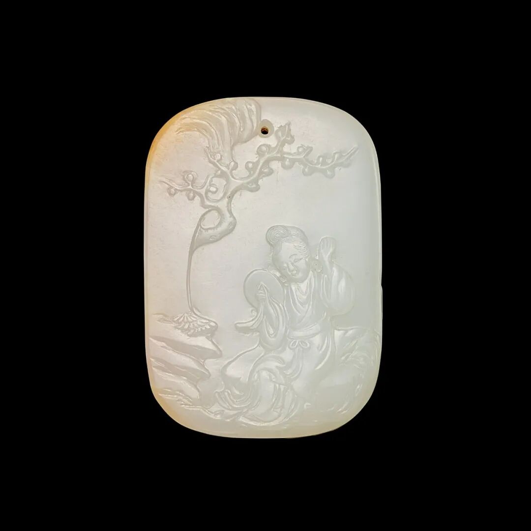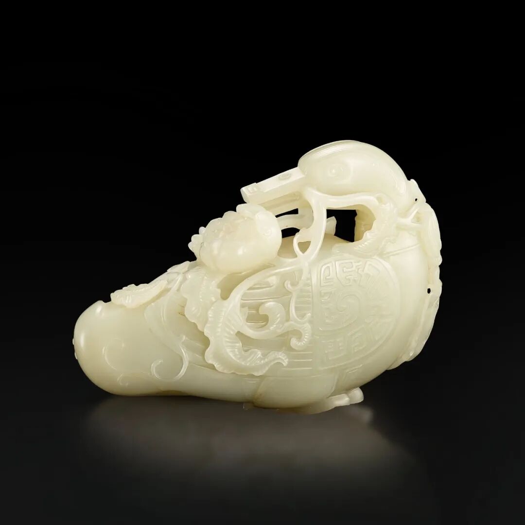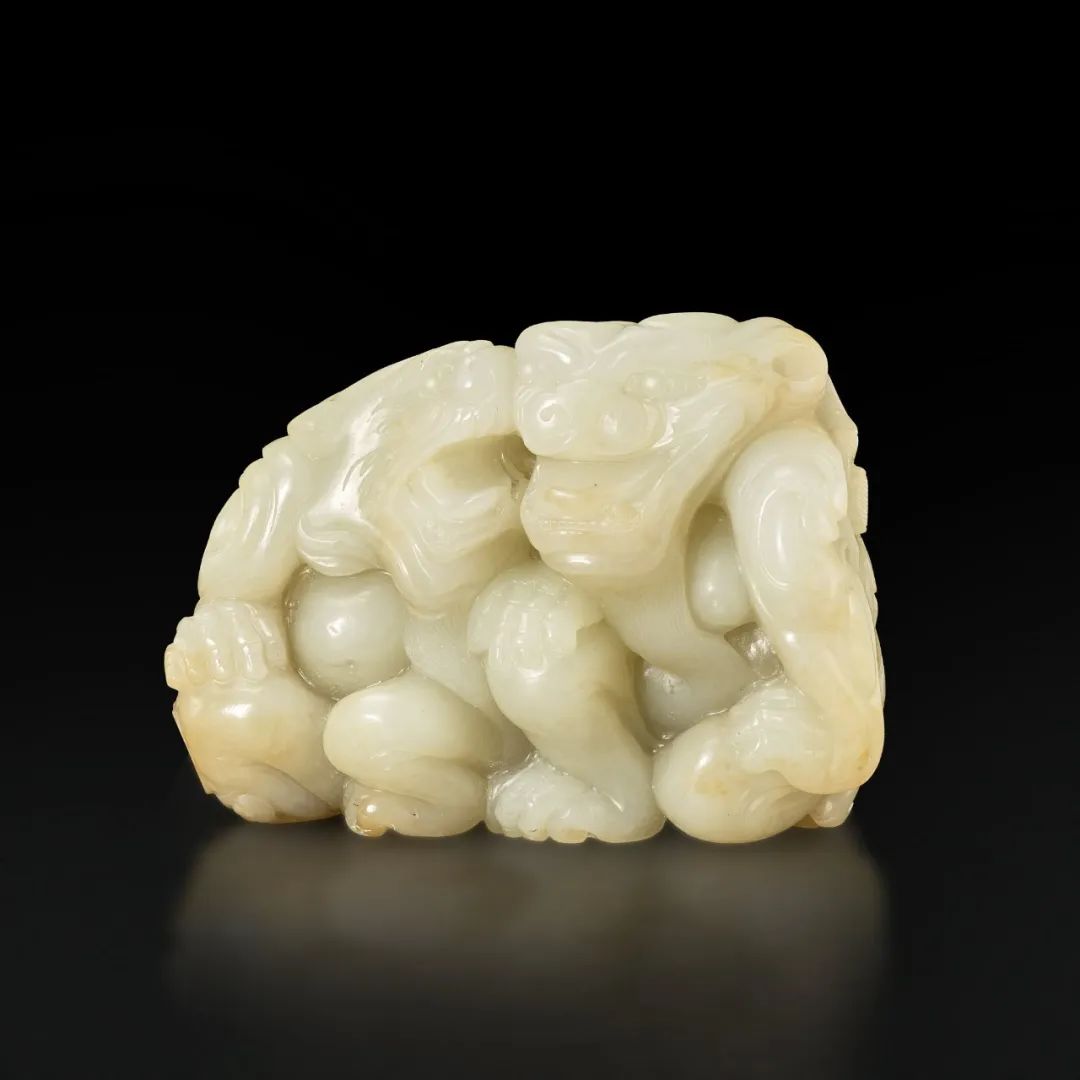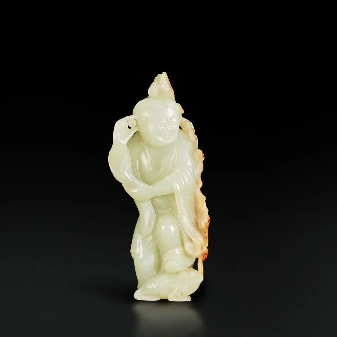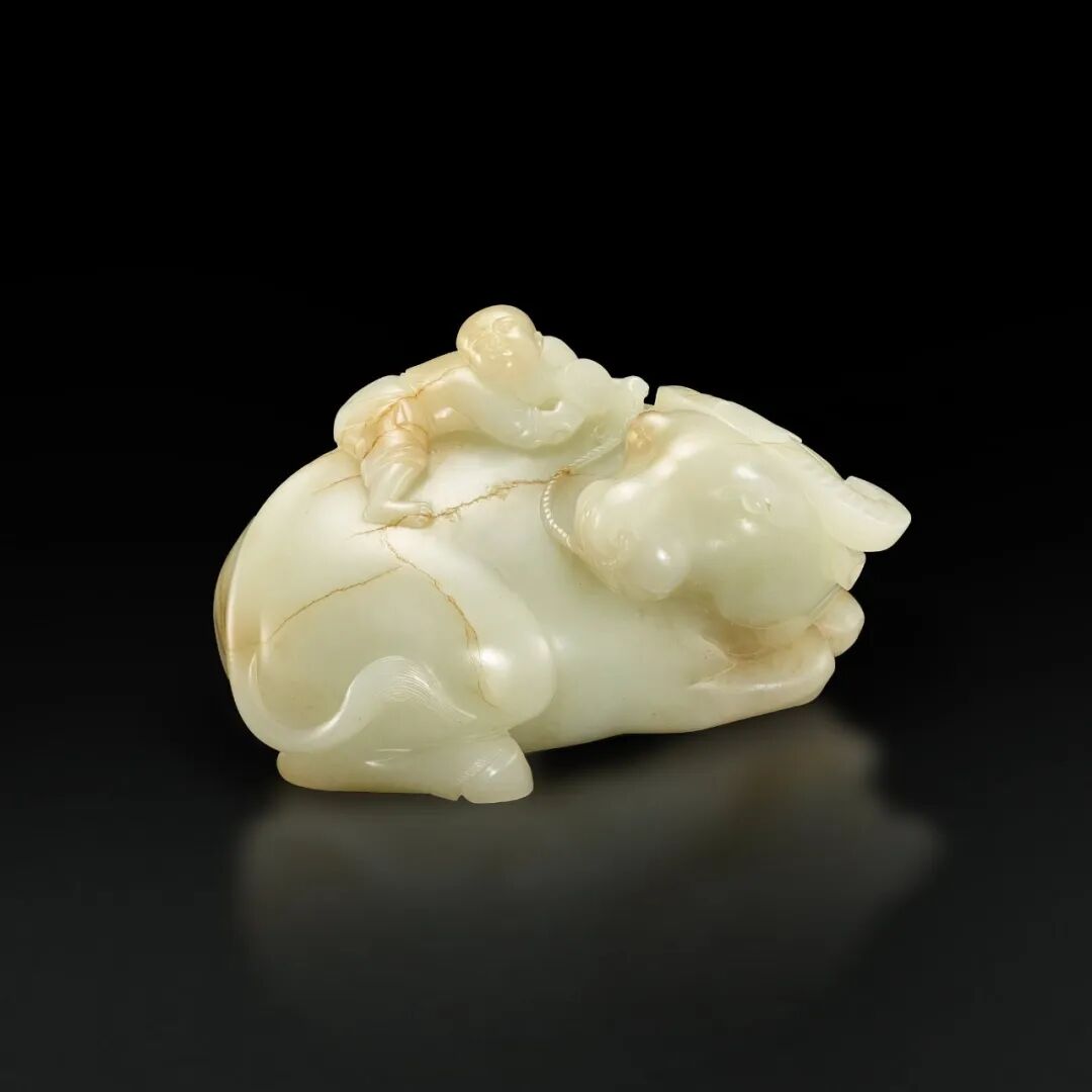 白玉闪青,此件雕童子牧牛极为生动,不论卧牛或是童子的胴体刻画,还是对其毛发、表情的细节表现都恰如其分,足显明清以来宫廷玉匠写实玉雕的娴熟工艺。