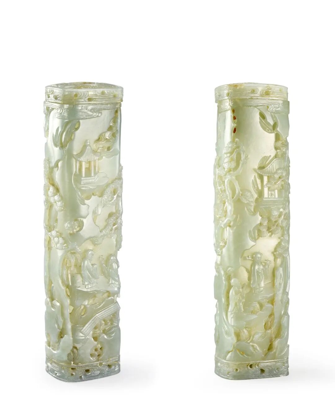 清 青白玉雕 高士楼阁香筒