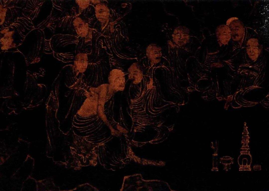 目前所能见到最早的香炉、香筋瓶、香盒炉瓶三事完整地呈现,可见山西省博物馆藏元至正丙午(1366年)日本发僧《金绘衹园大会卷》。此卷为释迦牟尼佛在印度佛教圣地祇园精舍说法传道的胜况,画面立意宏大,山水人物描绘极精,可谓旷世之作,亦是海内外孤本。留心便可发现在长卷的中偏后方,众僧围着大肚弥勒佛半圈说法论道,中间置三足戟耳炉一具、直筒形香筋瓶、瓶中置椭圆匙头曲颈香匙及香筋一副、圆形香盒。《金绘衹园大会卷》在炉瓶三事的陈设研究中极具意义,开启了明清以来绘画中香事具陈设的先河,可谓炉瓶三事组合陈设之祖。