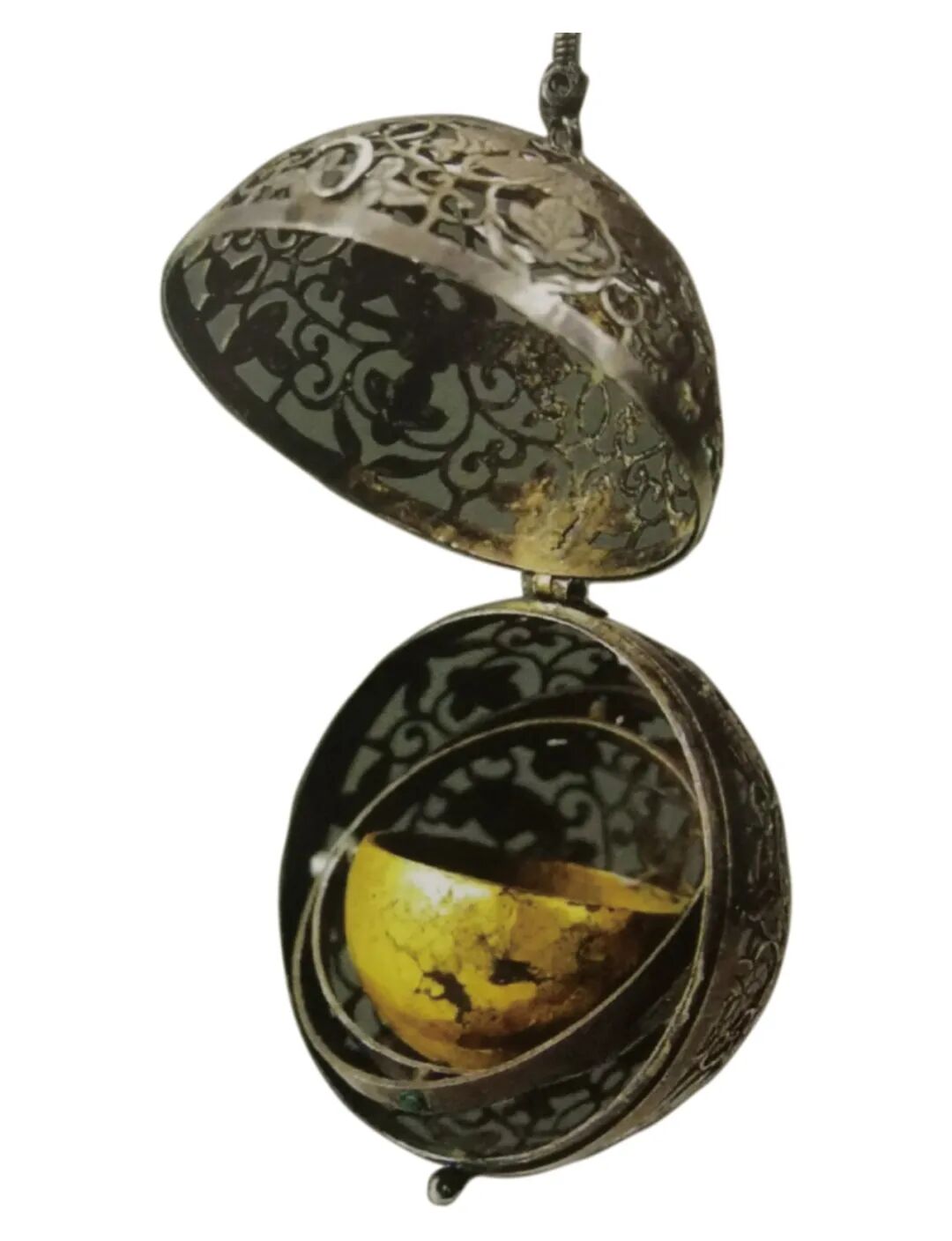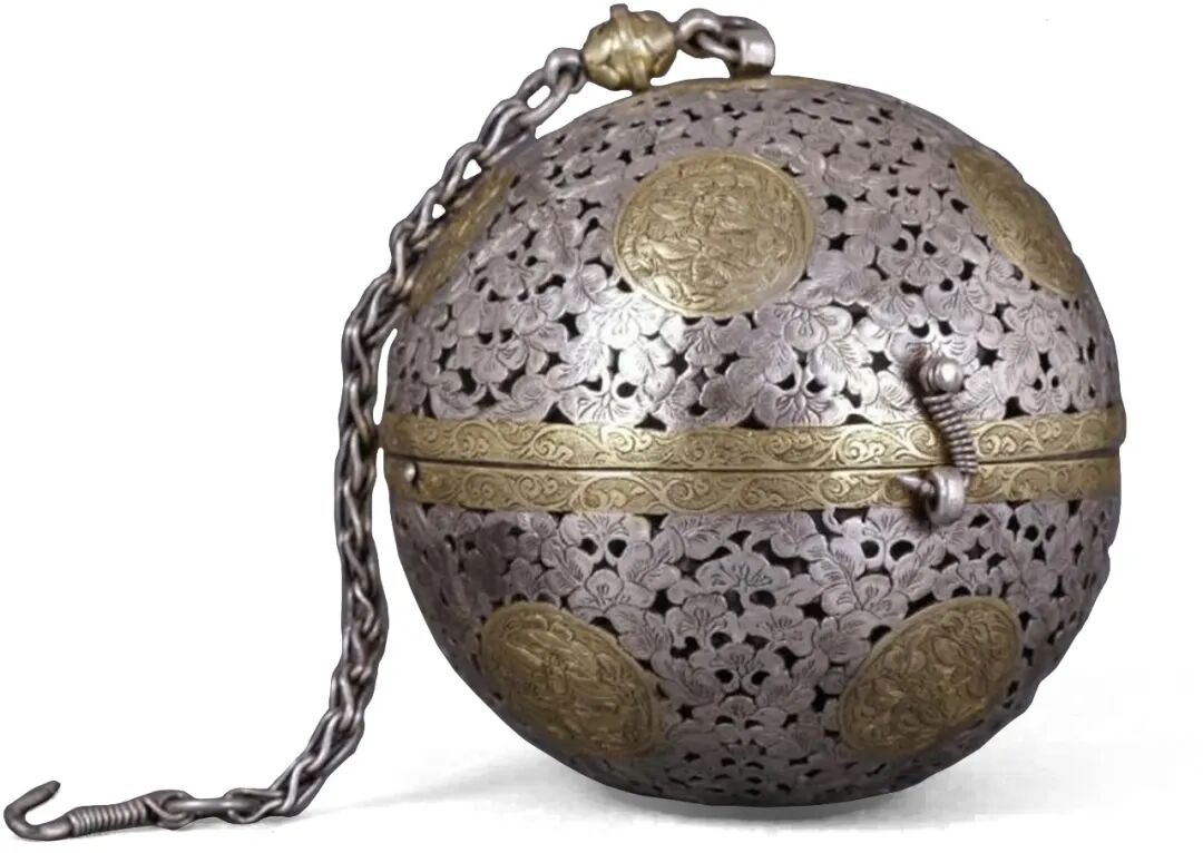 唐代薰球,出土所见已有数例,较为著名者,有西安南郊何家村窖藏出土葡萄花鸟纹银香囊,及扶风法门寺地宫出土鎏金双蛾团花纹银香囊。从存世实物可知,唐代的香球不仅结构精巧,装饰亦甚繁复华丽。如此成熟的器型不应凭空出现,《西京杂记》载汉时已有此香具,亦属合理之事。