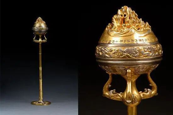 其一为陕西历史博物馆藏鎏金银竹节铜熏炉,出土于陕西省兴平市茂陵东侧丛葬坑中。此件博山炉造型高挑,有竹节状长杆,其盖缘刻有铭文:“内者未央尚卧,金黄涂竹节熏炉一具,并重十斤十二两,四年内官造,五年十月输,第初三。”将此段铭文与同时出土的“阳信家”铭铜器结合可推测,这件博山炉为当时未央宫中陈设薰炉,且为汉武帝赏赐给姐姐阳信长公主之物。