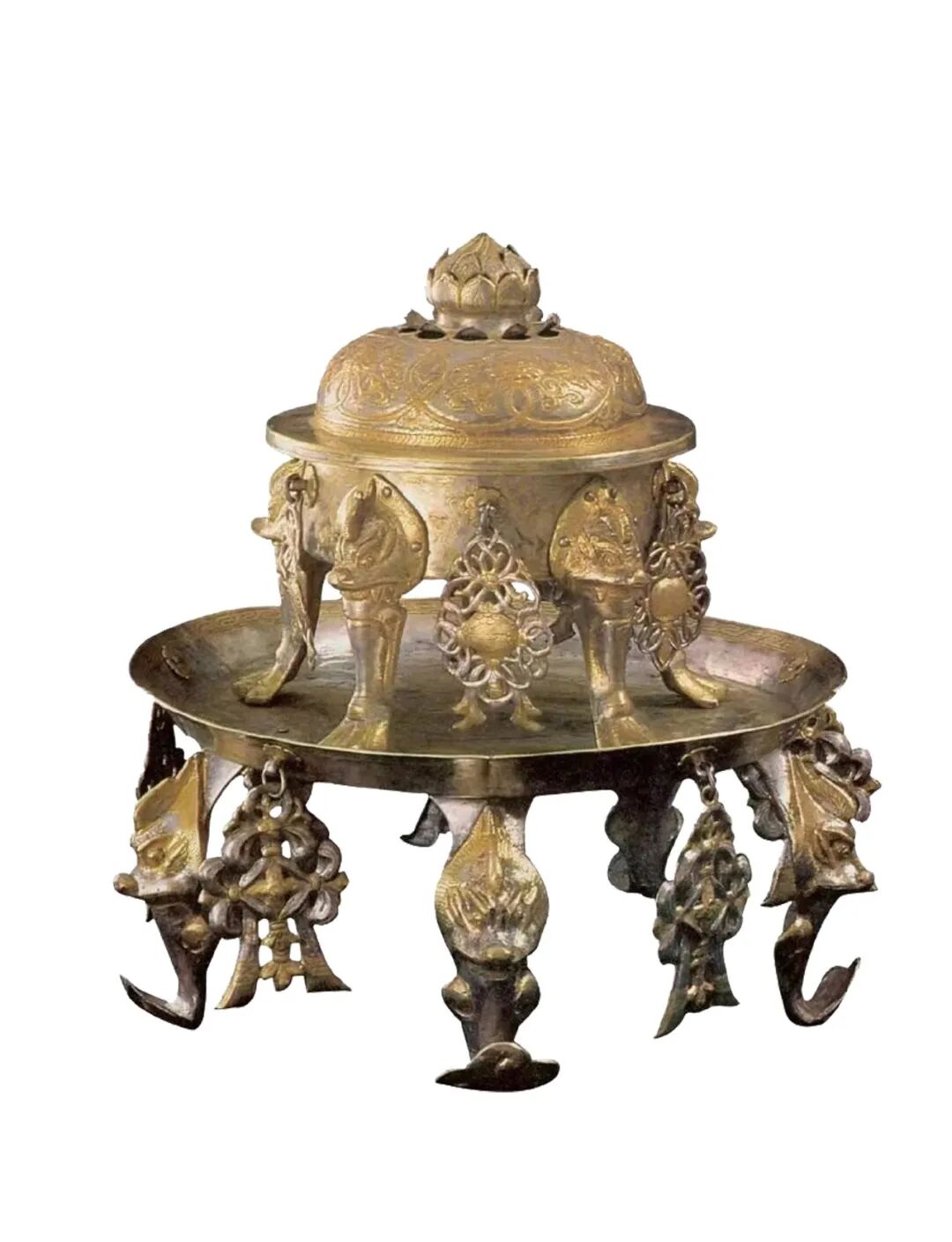 此外,唐代另见一种新创的莲花式香炉,是将装饰莲花的炉盖,与源自魏晋南北朝的多足香炉相组合,其尺寸较小,多三足或五足,带有承盘。这种炉形见有青瓷、三彩等数例,亦见有银捶揲而成的。其中最著名者,应是山西扶风法门寺唐塔基地宫出土的鎏金卧龟莲花纹五足银熏炉。地宫中一同出土的香具,还有封签自名“大银香炉”和錾刻“五十两臣张宗礼进”的银薰炉两件、银鎏金狮纹香盒一件,和银鎏金香宝子(专门盛放香丸、香饼的容器,多为成对与香炉一同陈设)两件。这批银器完好地保存了唐代香具的品类和形制,可见香炉在佛教艺术的影响下,嬗变出了新的风格,其中五足薰炉、香宝子等器型,也深刻影响了宋辽香具的器型。