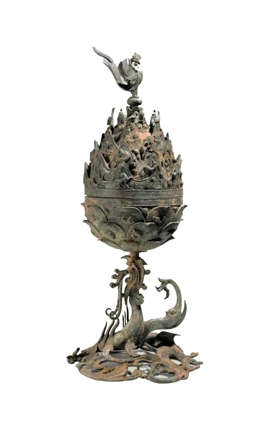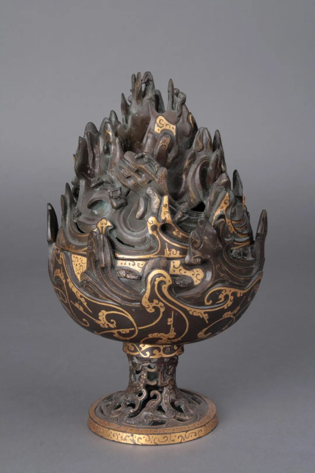 其二为河北博物馆藏错金博山炉,出土于河北省满城陵山一号墓,为西汉中山靖王刘胜随葬之物。此件博山炉造型更接近于传统的豆式薰炉,但施以繁复精巧的镂雕与错金工艺,华丽甚至更胜于未央宫中之物,这与历史中对刘胜生活奢靡的记载相吻合。此件博山炉出土于墓后室的小侧室中,与博山炉一同出土的,皆为搓石、盆等沐浴用具,故学者推测其应作沐浴焚香之用。