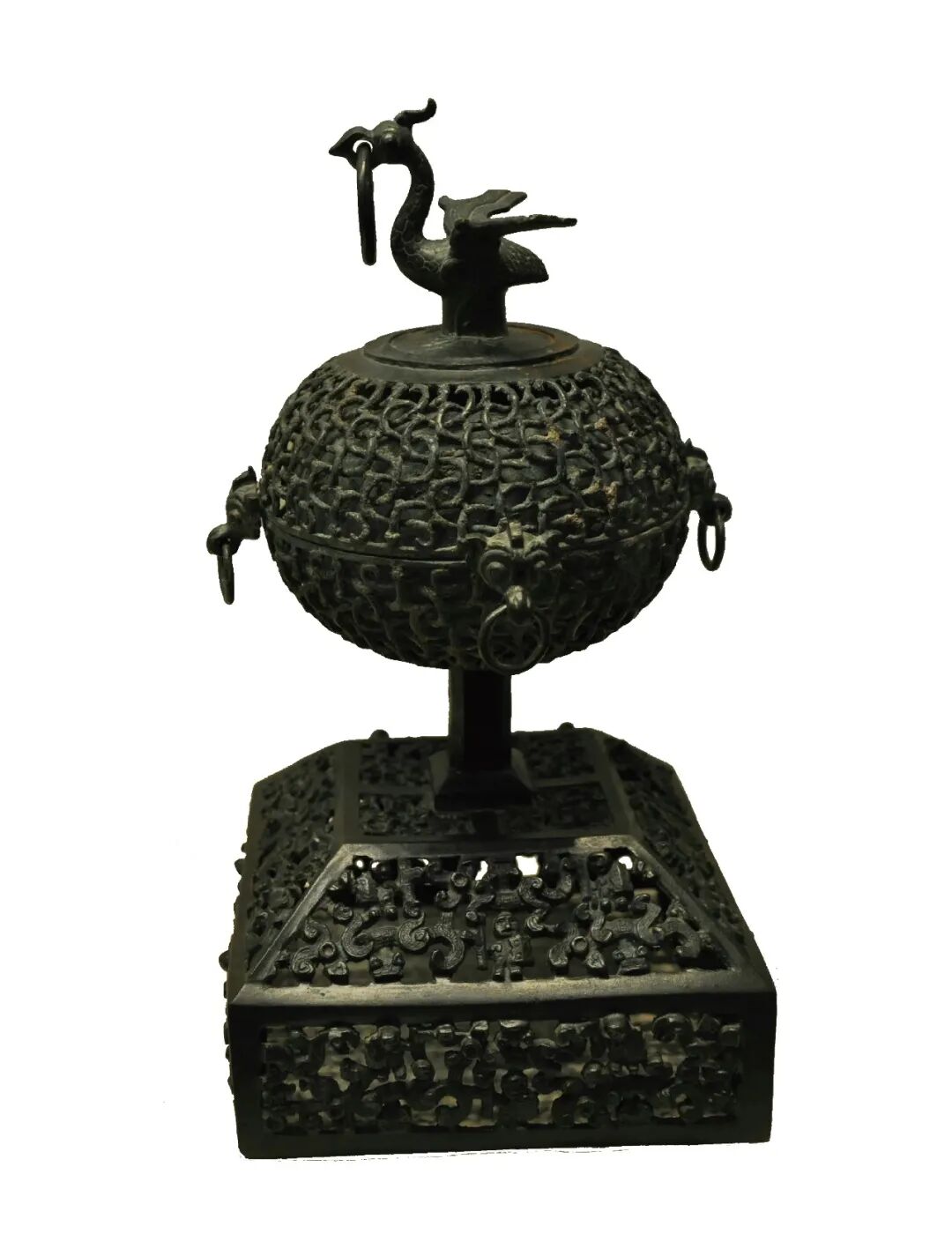 春秋战国时,用薰炉薰烧香草的做法已较为多见,在江南楚地及山东、湖北、湖南、浙江等地都见有各式镂孔薰炉出土,以形似豆的高足形制最为典型,其造型亦可看出与西汉博山炉的传承关系。存世实物较精美者,可见陕西凤翔县出土的一件铜质凤钮薰炉,为春秋晚期至战国早期秦地之物。其作繁复镂空的球状,可置香草于其中,顶设凤鸟钮,玲珑精巧,显出非凡的铸造工艺,应是当时贵族堂室中所用之物。