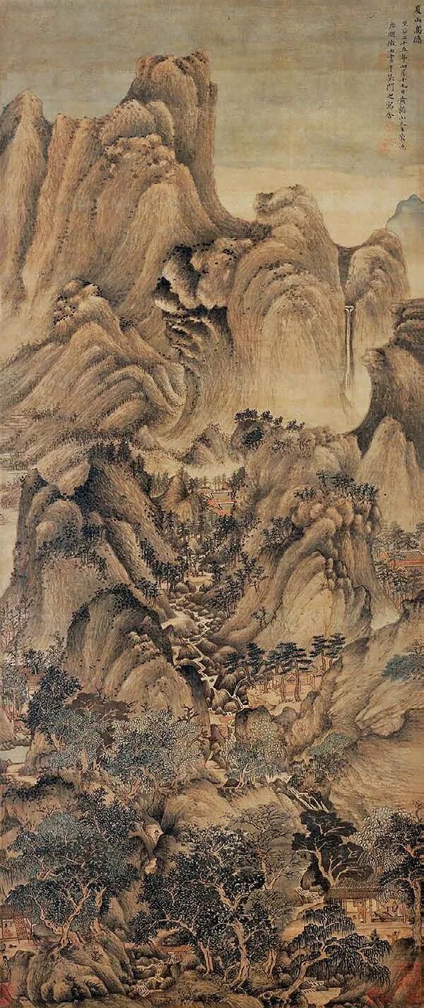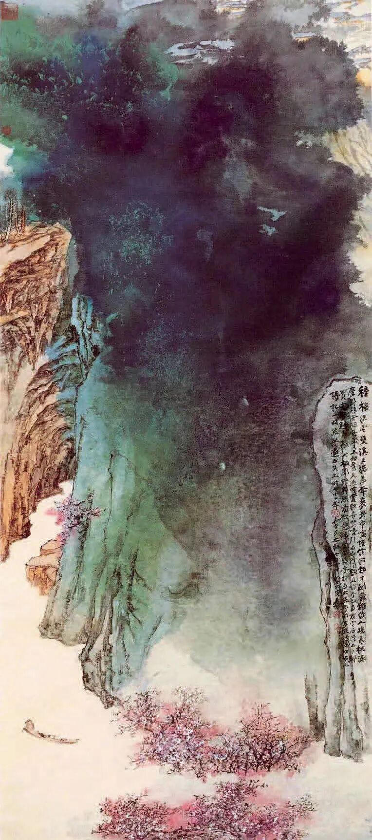 丁亥(一九四七)四月大千居士临此巨作,题赠给李秋君女士,自是他精心作品之一。若与原迹比较,也有若干变动,最大的不同是将近景的空间距离延伸了,中景的山和泉又拉近了,流泉扩大成布网状,山石的造型和皴法也有细微的变更,林木屋宇也都参有己意。因此,严格来说,这是借用了王蒙的章法结构,自运而成的作品。