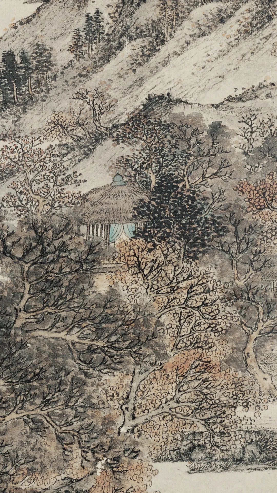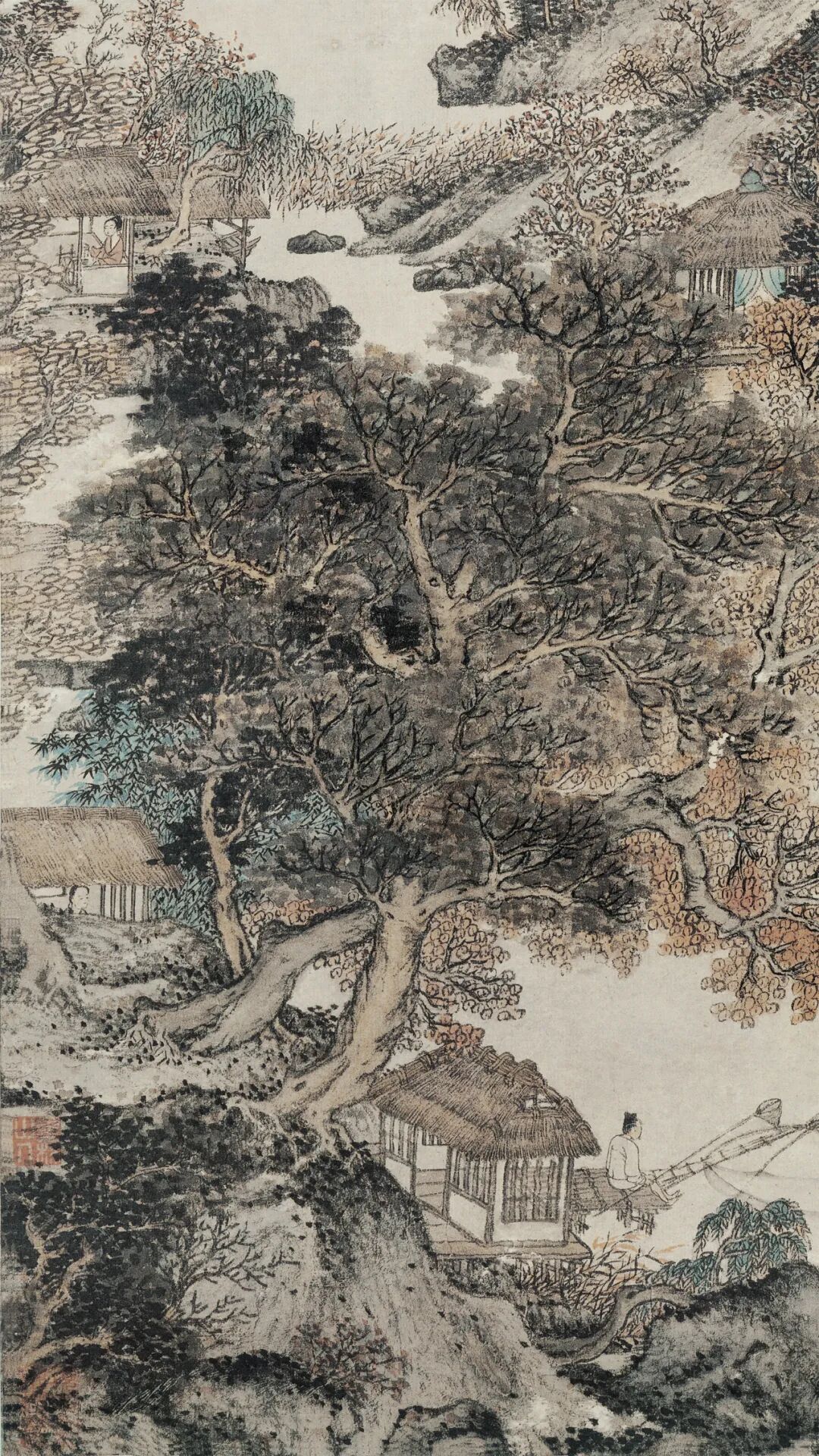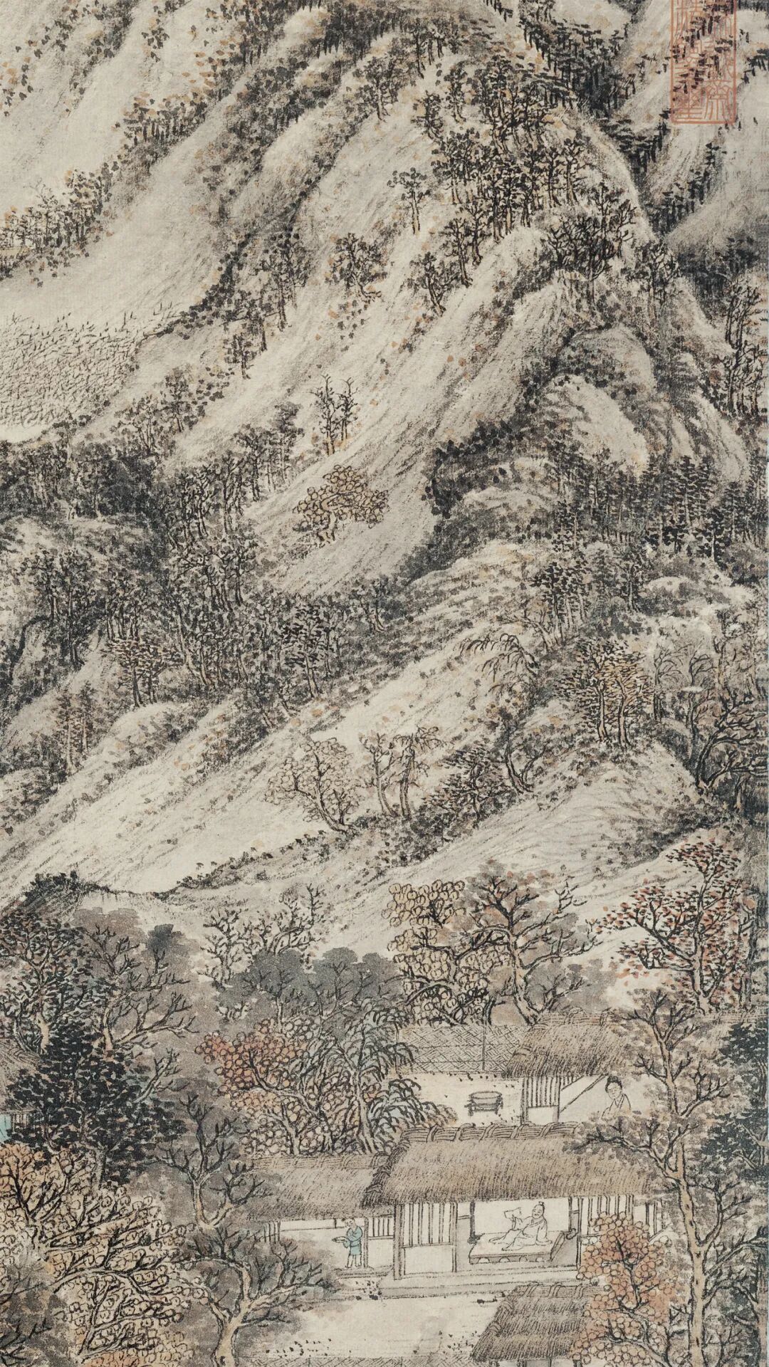 王蒙作为元四家之一,其作品量丰富,画风影响深远。他的《秋山草堂图》是一幅描绘江南山水风光的作品。与《青卞隐居图》的磅礴略有不同, 《秋山草堂图》虽未标明创作年代,却体现出王蒙早期明净的画风。画面从近景丛生的树木过渡到中景村舍,再由中景群峰推至远景群山,再现了郭熙笔下“平远、深远”的意境。此时,由于远山远水的淡雅笔墨,使得画面开阔广袤,一望无尽,与黄公望提出的“阔远”气势较为类似,且颇有元代赵孟頫古厚的风范。