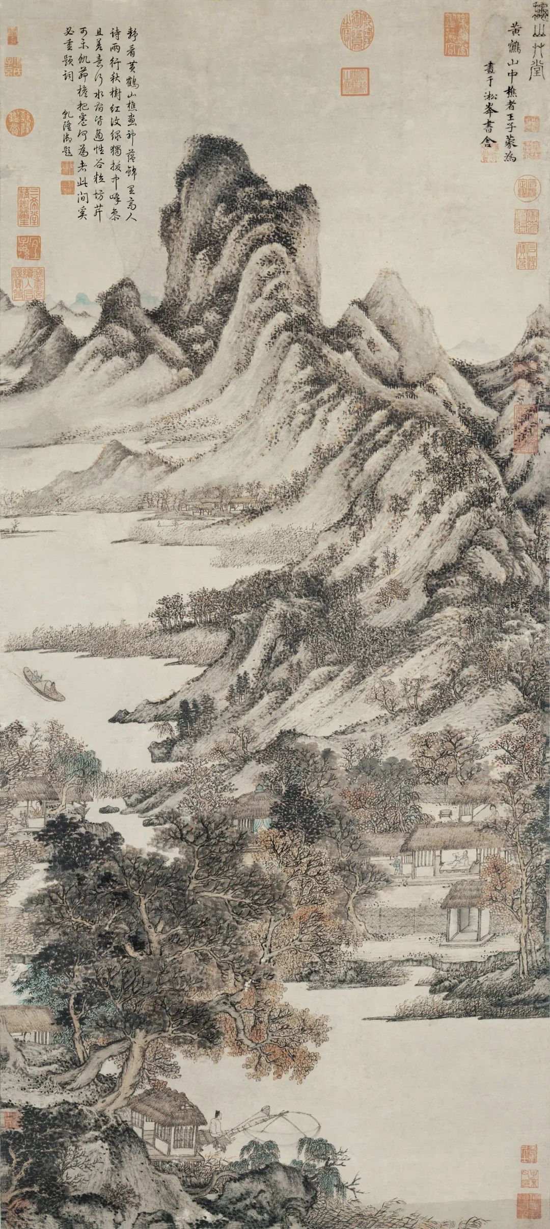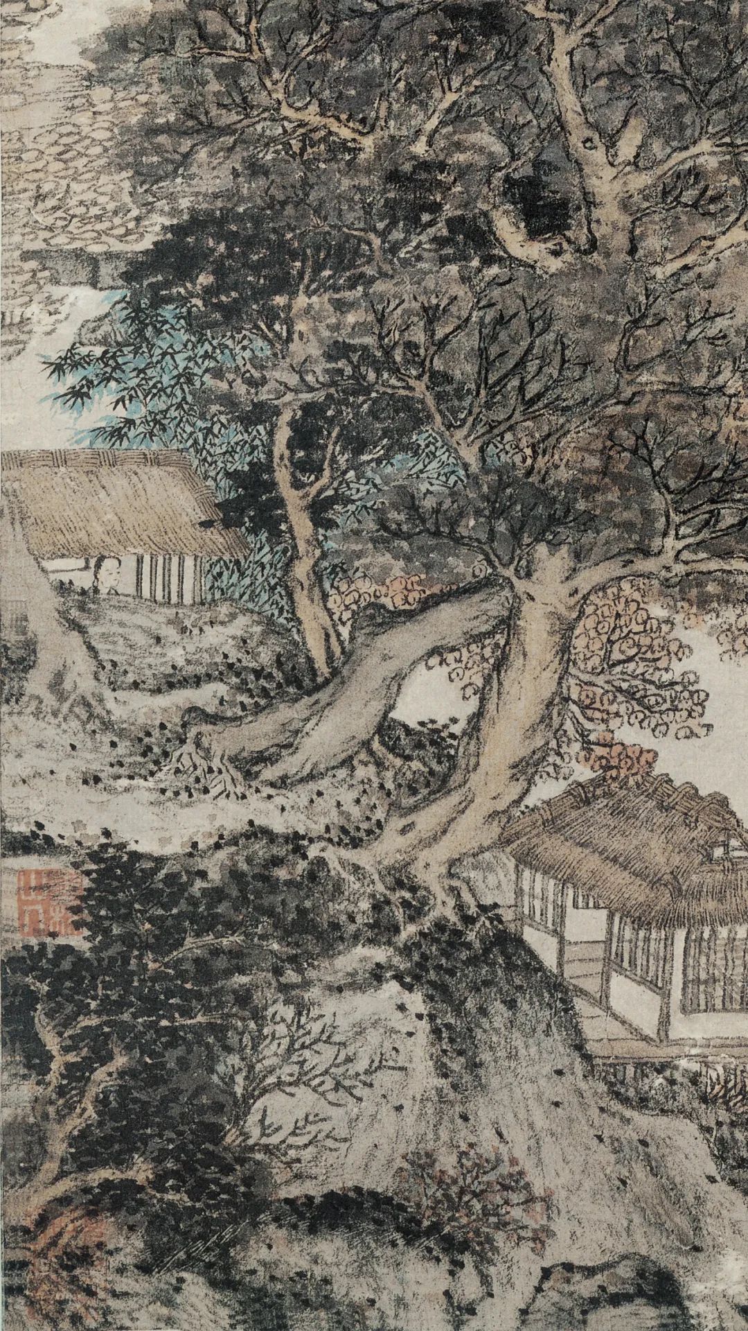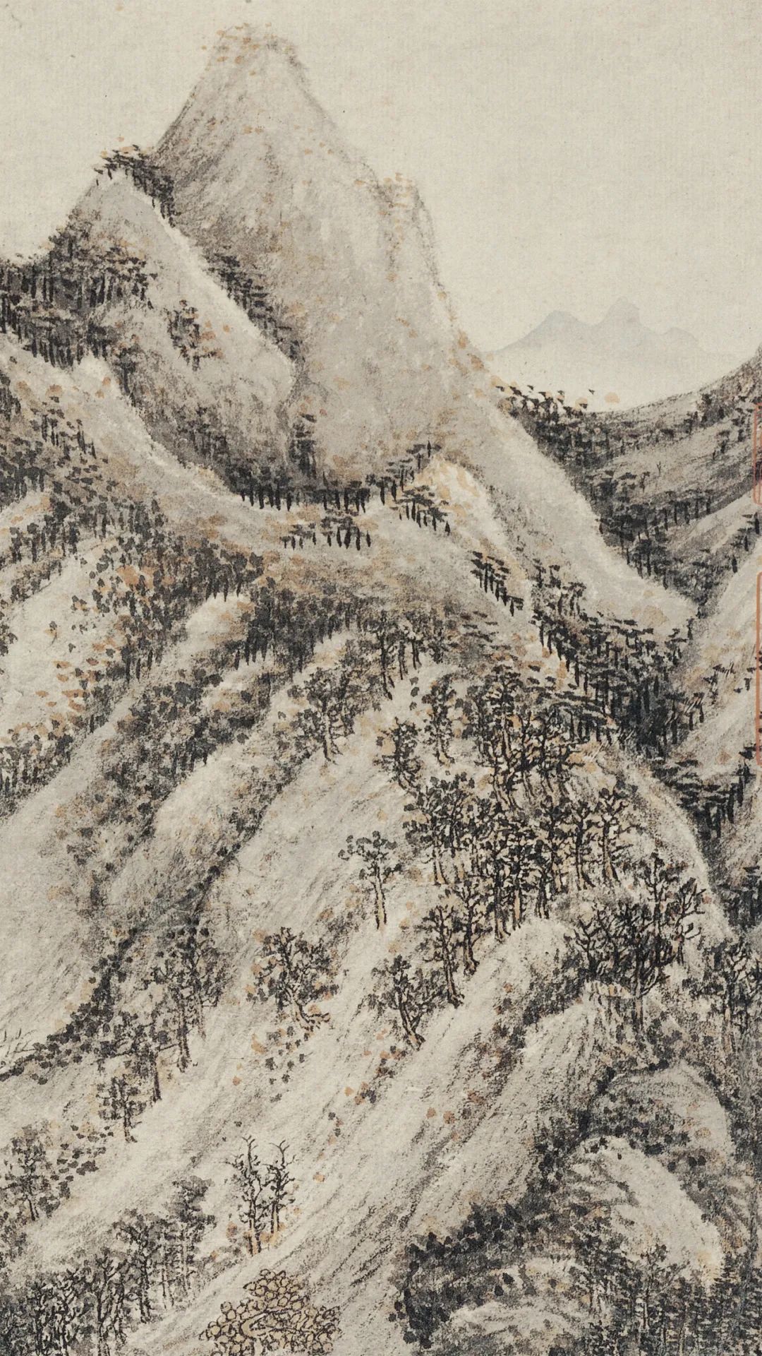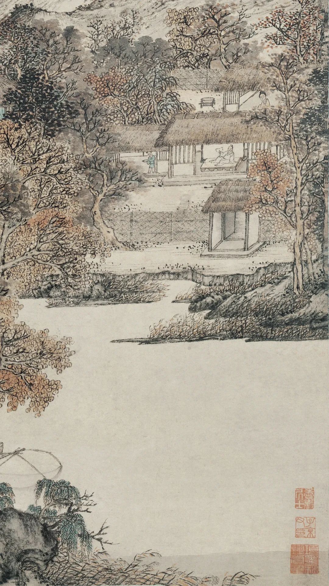 王蒙作为元四家之一,其作品量丰富,画风影响深远。他的《秋山草堂图》是一幅描绘江南山水风光的作品。与《青卞隐居图》的磅礴略有不同, 《秋山草堂图》虽未标明创作年代,却体现出王蒙早期明净的画风。画面从近景丛生的树木过渡到中景村舍,再由中景群峰推至远景群山,再现了郭熙笔下“平远、深远”的意境。此时,由于远山远水的淡雅笔墨,使得画面开阔广袤,一望无尽,与黄公望提出的“阔远”气势较为类似,且颇有元代赵孟頫古厚的风范。