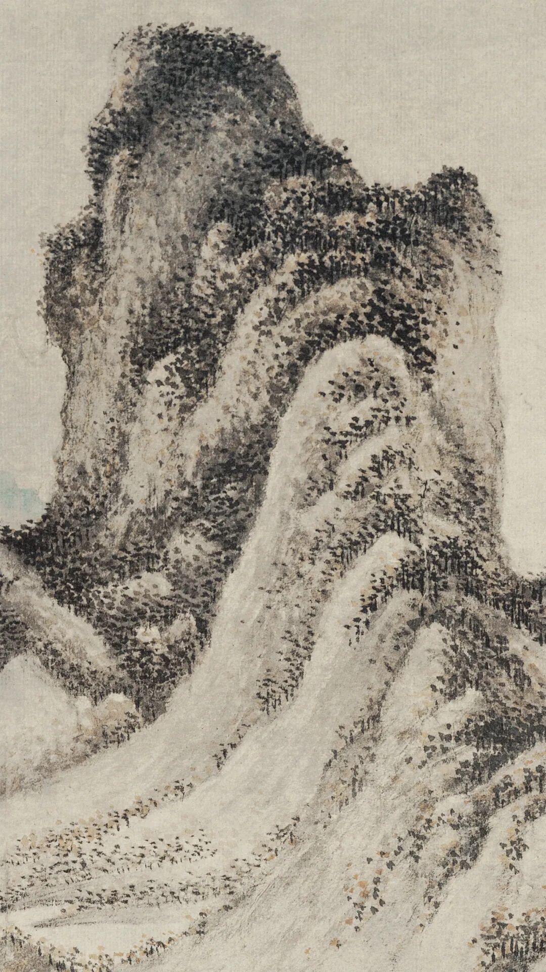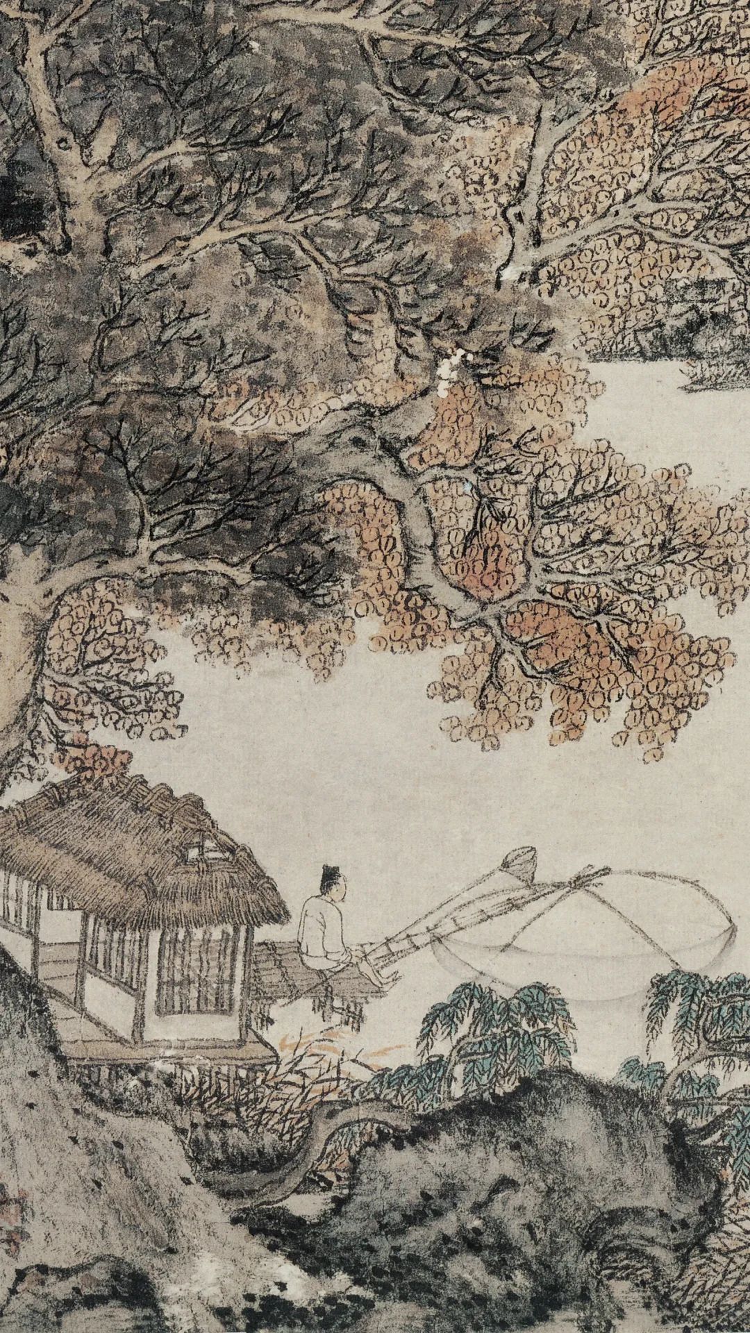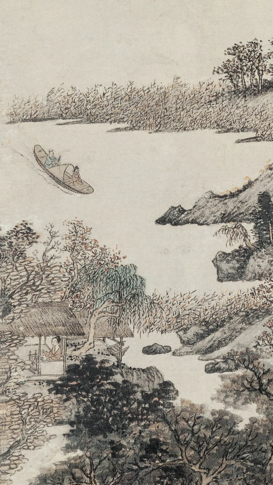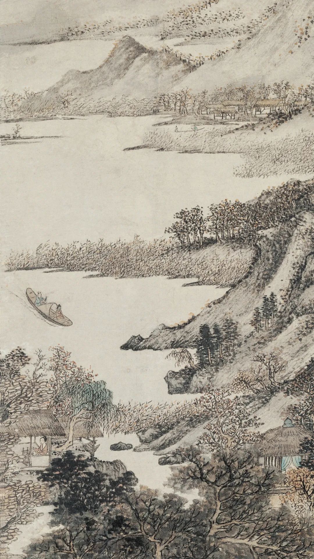 这样一个寄情转换的过程是建立在多年学识积累之上的,需要在天人合一的境界里对人、自然、宇宙有一个物我相融的博大概念。天人合一作为中华文化的古老命题,阐述的是人与自然在本质上的相通,对历代文人的处世哲学及山水画的发展产生了极大的影响。道家有言“人法地,地法天,天法道,道法自然”,巧妙地将天地人的秩序都归合自然万物之中,强调人不为外形所累,在天地间自由畅神。而儒家则进一步指出自然与人的关系,“知者乐水,仁者乐山。知者动,仁者静,知者乐,仁者寿”,通对抽象概念的形象化解读,将仁者和智者的品质比拟山水特性:山川高大沉稳,流水多变灵活。文人通过山水灵性来陶冶自我,提升自我,虽不能至,而心向往之。无论是乐于山水、故友相逢、身心愉悦还是家国沦丧、仕途失意、身心落魄,他们都能在描绘山水的笔墨间达到内心“不以物喜,不以己悲”的平衡,以一颗处变不惊的心来正视瞬息万变的周遭环境。