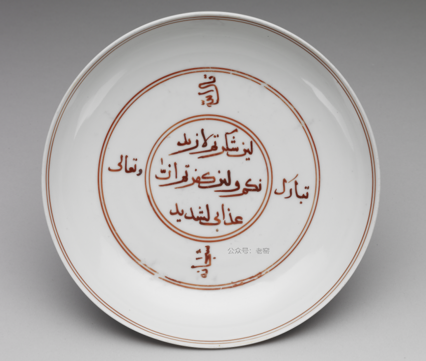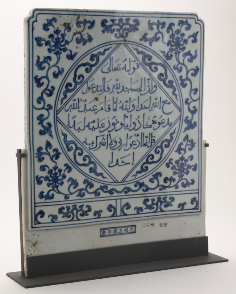 这件罕见的瓷屏写有《古兰经》 72章18到20节:“一切清真寺,都是真主的,故你们可以祈祷真主, 不要祈祷任何物。当真主的仆人起来 你说:我只祈祷我的主,我不以任何物配他。”