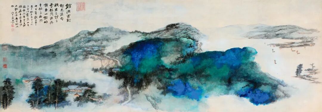 张大千(1899-1983)《灵岩山色图》,绢本设色,95 × 265 cm., 1981年, 私人收藏。此作正于 “南张北齐 —张大千齐白石书画艺术特展” 中展出。图片鸣谢龙美术馆