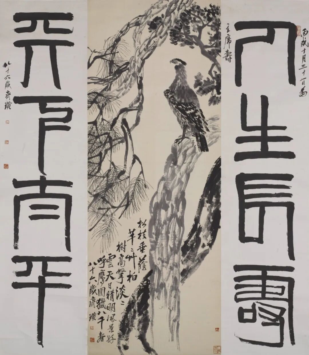 张大千和齐白石的艺术周期都很长,生命力又特别旺盛。齐白石在1930至1940年代间创作了很多精品,包括家喻户晓的工笔草虫,此次展览呈现的一件经典之作《可惜无声》(1942年作,十二开册页),画中蛐蛐、螳螂、蚂蚱、在草木花卉中展现一派田园生机,令观者仿佛身临其境;《九秋风物图》(1944年作)是荣宝斋的镇斋之宝,蝉脱壳之前的状态更令场景充满野趣,观者无不惊叹齐白石对生活的情趣与洞察力;另一幅一经展出即成为观众争相合影之作《松柏高立图·篆书四言联》,作品中的巨幅对联“人生长寿,天下太平”,极富美好寓意,振奋人心。