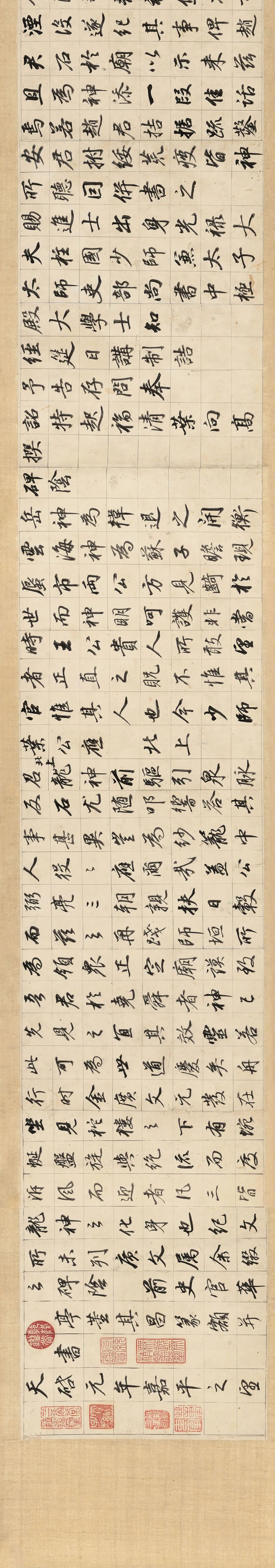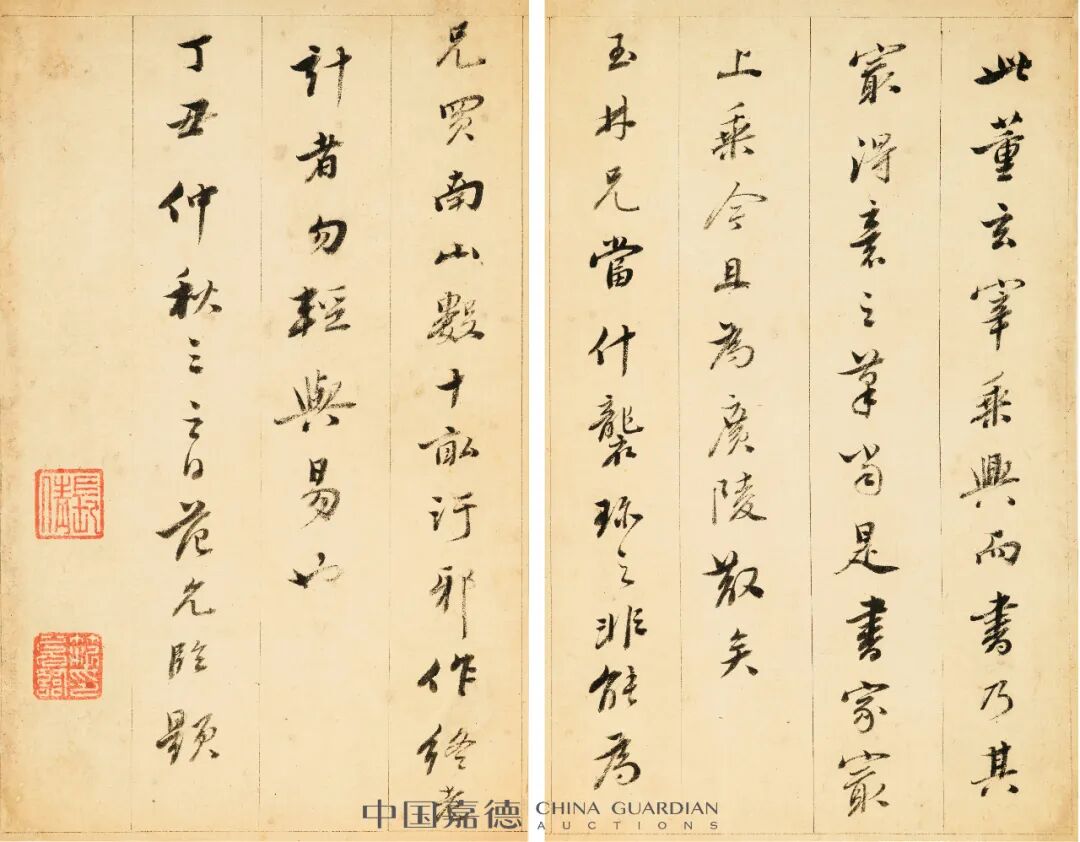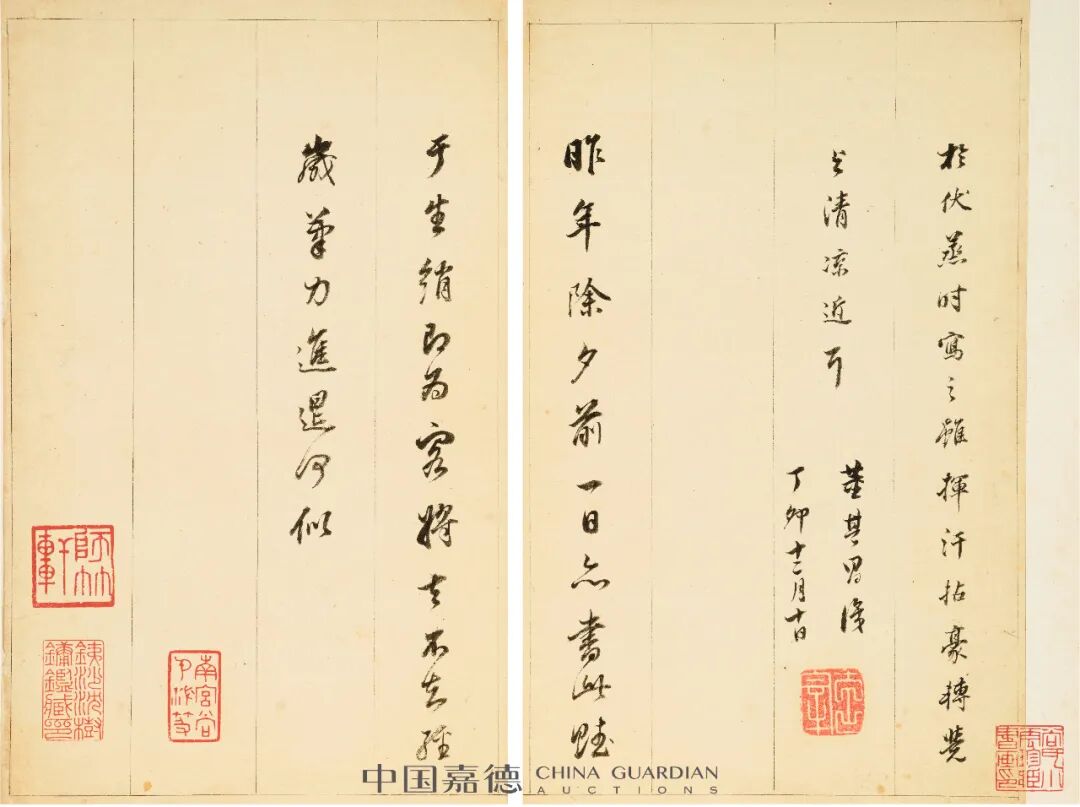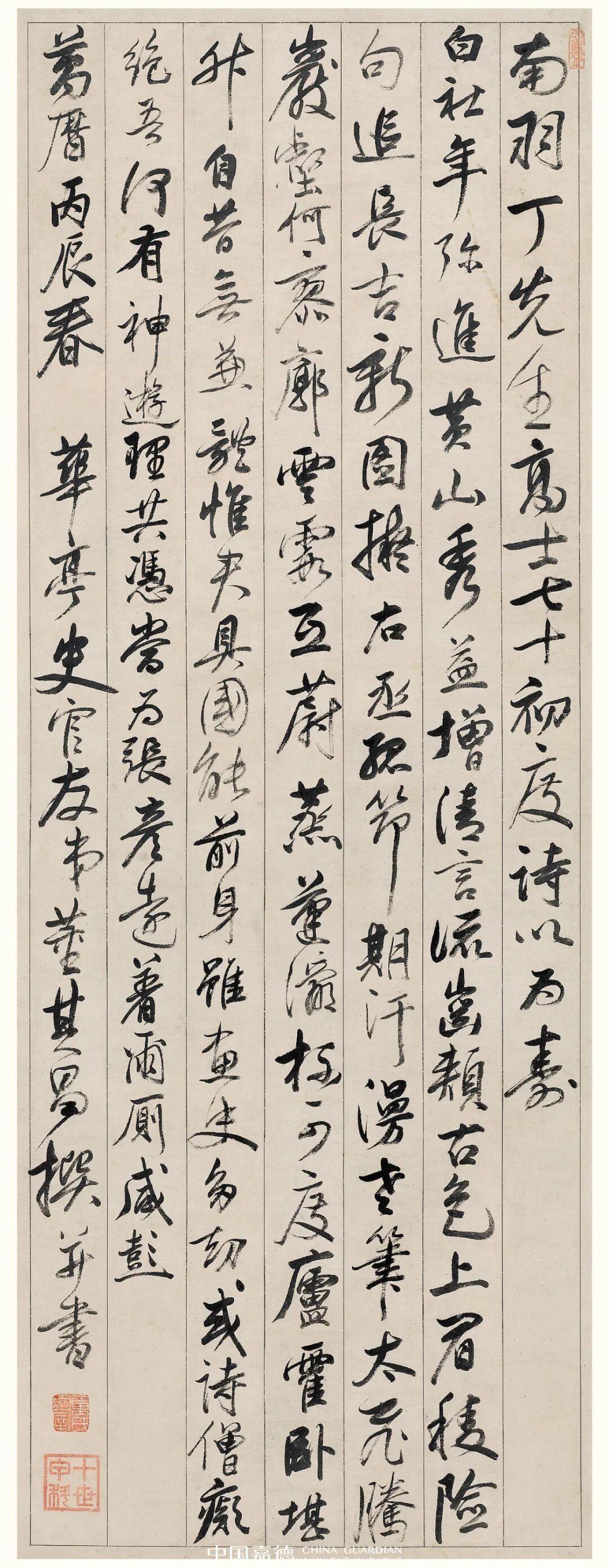 此轴为丁云鹏七十寿而作,所云:“岩壑何寥廓,云霞互蔚蒸……自昔无兼体,惟君具国能。前身虽画史,多劫或诗僧。”并非全是恭维之话。本轴书写流丽,情韵兼长,作大幅而界乌丝栏,在董书中殊少见,可见其用心。保存亦精,曾入藏北京市文物商店,且经多次出版,是极为难得的佳作。