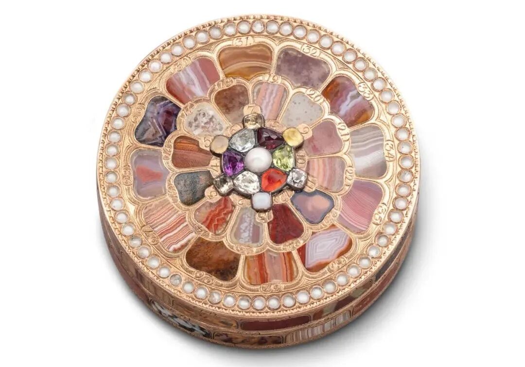德累斯顿宫廷珠宝商约翰·克里斯蒂安·纽伯(Johann Christian Neuber)的作品不但华丽典雅,而且别出心裁。此盒镶嵌101 种硬石,而每块硬石上方的黄金之上刻有数字,供物主按号码在随附的说明手册中查看每种矿石的名称和原产地。