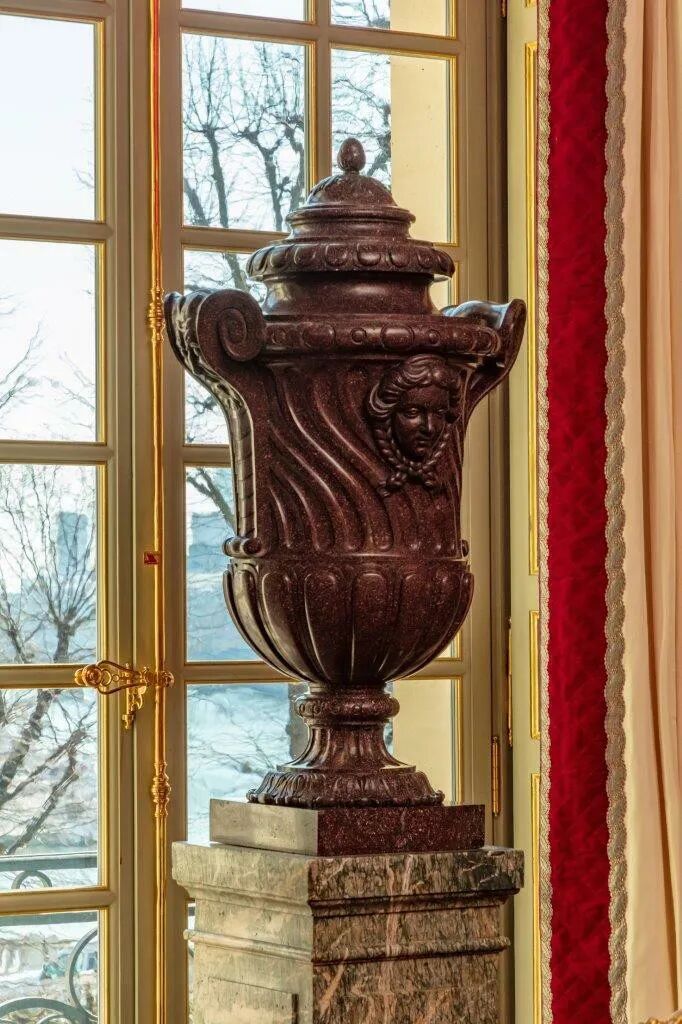 红斑岩象征无上权威,深得法国国王青睐,而且其意义由来久远,可追溯至古典时代。这对瓶的设计融入了路易十四时期首席宫廷画家夏尔·勒布伦的风格特色,特别是瓶身精工雕琢的女性面容纹饰,一双辫子连接于下巴处,是常见于凡尔赛宫沙龙艺术的女性人面形像。