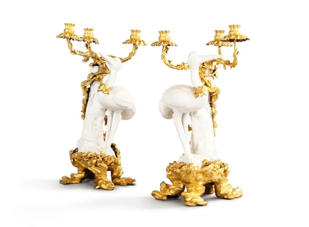庞巴度夫人的烛台:鎏金铜中式白瓷烛台一对