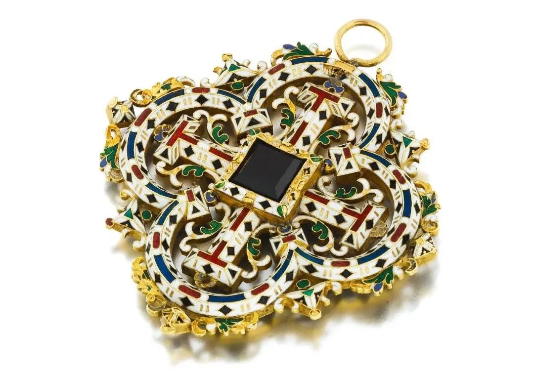 此吊坠历史悠久,在近年现身市场的早期西班牙珠宝中属于数一数二的杰作,它由黄金和钻石组成,并采用优质的珐琅,华丽非凡,是一件带有宗教意义的首饰,相信曾属西班牙宫廷主要成员所有,后来由重要珠宝收藏家贺普家族纳入珍藏,他们的收藏包括著名的「希望钻石」(Hope Diamond)。