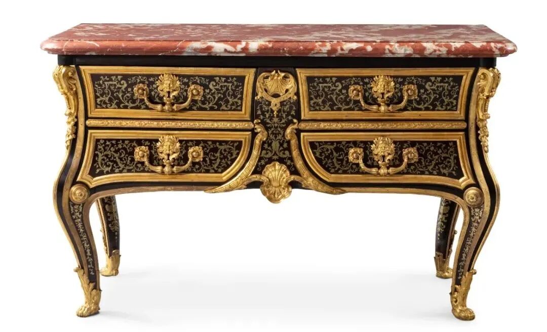 伯纳德·范·里森伯格一世(Bernard I van Risamburgh)的家具作品为数不多,这个华美瑰丽的斗柜是其中一件作例,曾属法国政治家路易斯·查尔斯·德·麦克豪特(Louis-Charles de Machault,1667-1750年)珍藏,他身后由儿子尚巴蒂斯德马舒尔特达劳维尔(Jean-Baptiste Machault d’Arnouville,1701-1794年)传承,后者的家具和艺术收藏数量庞大,藏品获公认为 18 世纪法国家具珍品,其中两件著名藏品现存于凡尔赛宫。