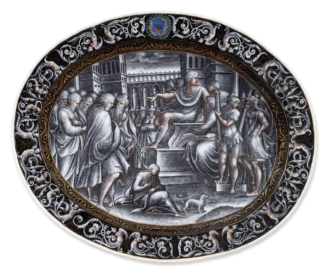 Limoges里蒙珐琅灰色椭圆盘,《审判摩西》