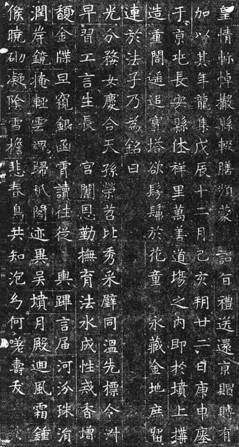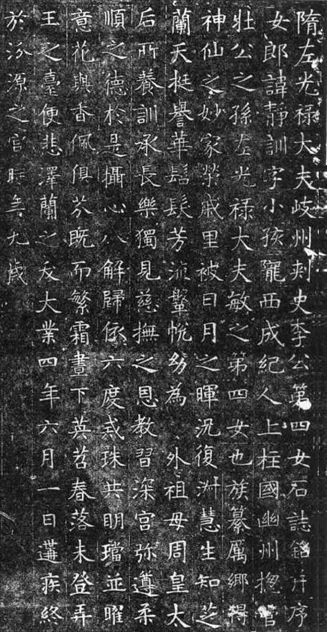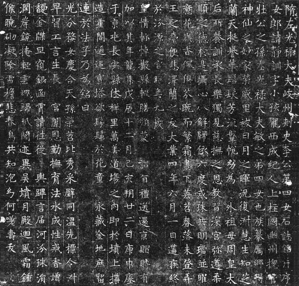 李敏后来娶了北周宣帝宇文赟与皇后杨丽华的独女宇文娥英,封为上柱国,官至光禄大夫,杨丽华还是杨坚的长女,杨丽华十分溺爱外孙女李静训,李静训便从小被养育在宫中,性格乖巧,相貌甜美,“得神仙之妙”,享受着所有人的宠爱。李静训是在9岁突然染病而死的,“悲泽兰之夭”。杨丽华十分悲痛,决定厚葬自己的小外孙女,历来都有盗墓事件发生,杨丽华不忍外孙女也遭受这样的事情,于是将李静训葬在了皇宫旁,当时皇帝都没有资格修陵墓在皇宫旁,但杨丽华就是做到了。下面是出土的墓志铭,字迹宽绰、舒展、娟秀,游走在法度与灵韵之间。类似这些典型的隋代书法风貌,代表着唐楷的先驱。