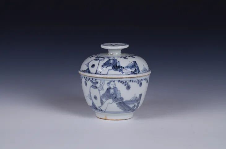 清·青花人物山水纹盖碗