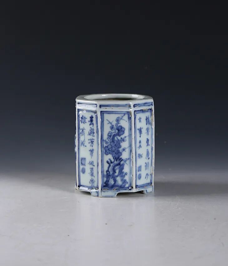 清·青花镂空花卉纹题诗八角笔筒
