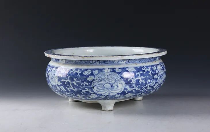 清·青花缠枝牡丹纹三足炉