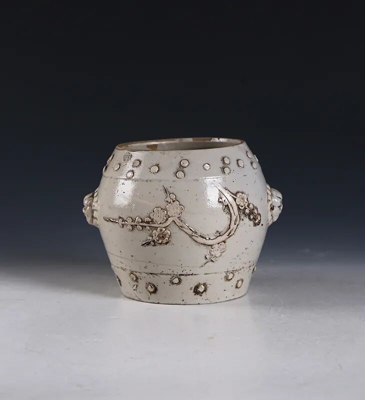 民国·白釉堆贴折枝梅花纹鼓形罐