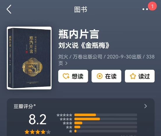 “豆瓣”一个叫“玉光引”的读者,不仅给予拙著《瓶内片言——刘火说〈金瓶梅〉》以四颗星的高评,而且肯定了拙著的“用心”和所做的“笨功夫”,同时提出疑问。疑问如下: