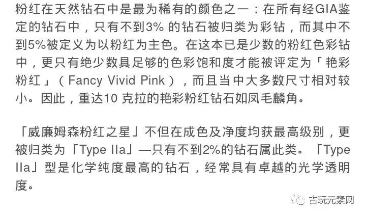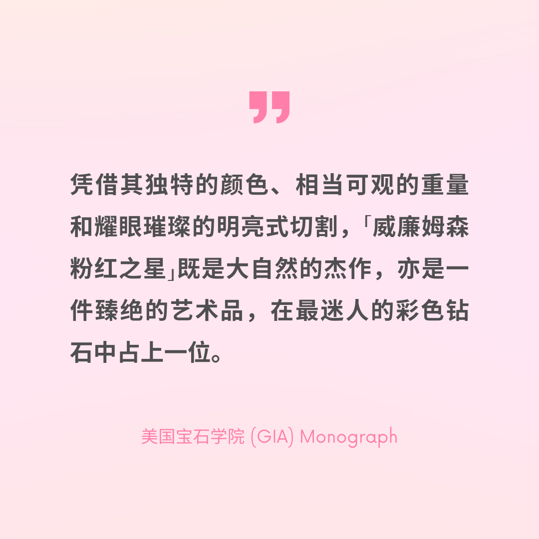 重11.15克拉的「威廉姆森粉红之星」(The Williamson Pink Star)为拍卖史上第二最大的内部无瑕艳彩粉红钻,仅次于2017年4月于香港苏富比以5.53亿港元破纪录成交的59.60克拉椭圆形切割钻石「周大福粉红之星」(CTF Pink Star),该钻石至今仍雄踞任何钻石及珠宝之世界拍卖纪录。如此完美纯净的「威廉姆森粉红之星」,原本预料成交额逾1.7亿港元,没成想一举冲破记录,以4.53亿港币天价释出!超具潜力成为艳彩粉红钻石每克拉成交额之冠 。负责打造「周大福粉红之星」的知名钻石商Diacore这次也担起「威廉姆森粉红之星」的制作重任。