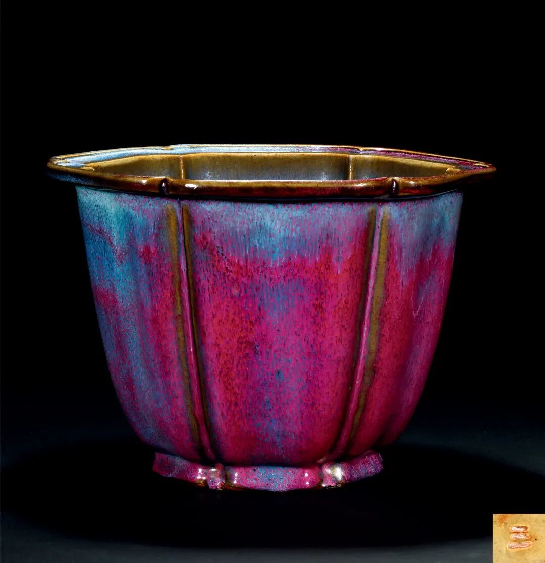 明早期 钧窑天蓝玫瑰紫釉葵花式花盆