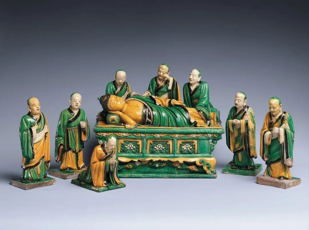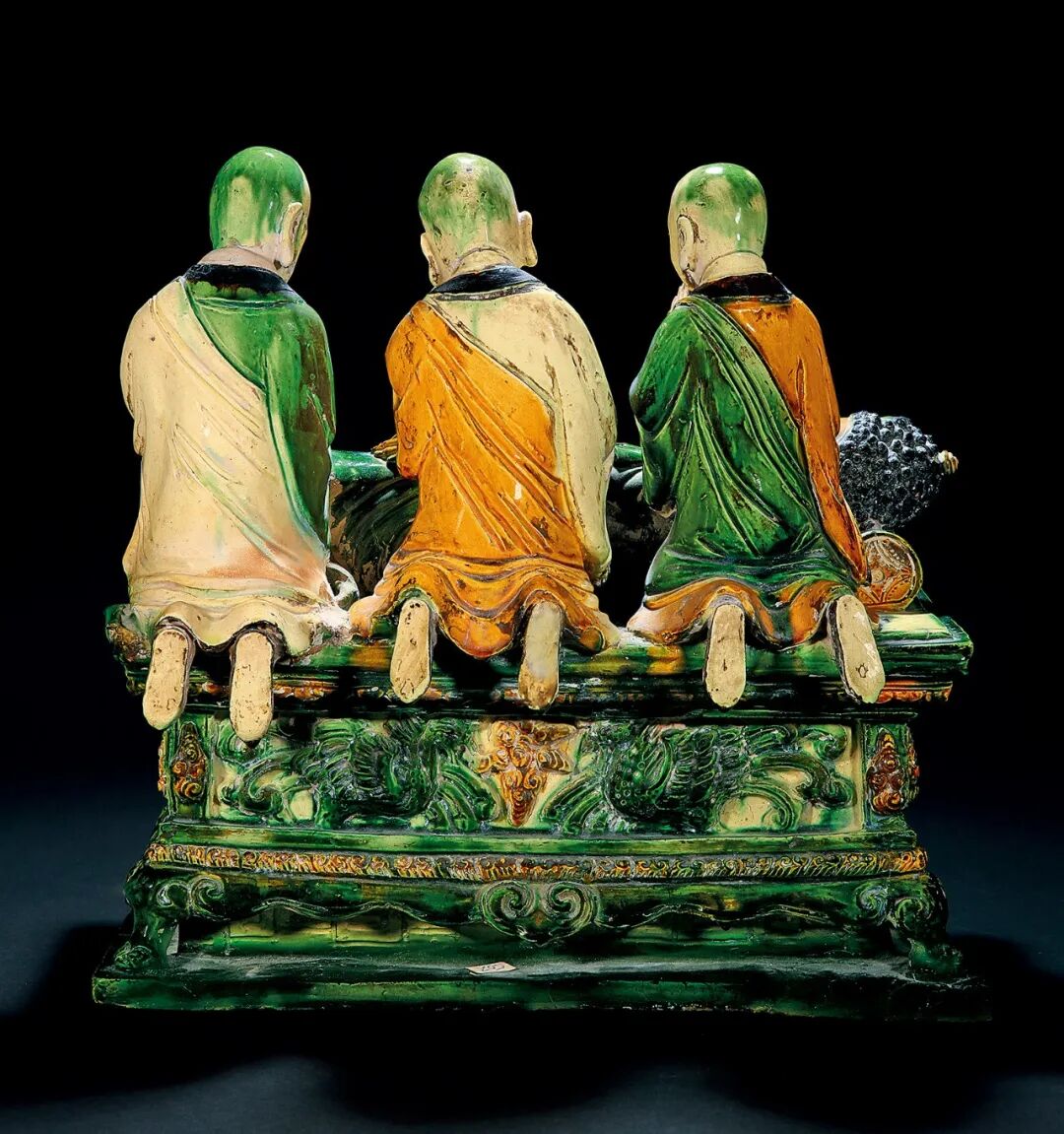 明代素三彩存世量较少,素三彩人物雕瓷更为稀有,而素三彩人物群雕组像更是难得一见,实属明代重要珍品。参考一例纽约大都会艺术博物馆收藏 1503 年明弘治素三彩佛祖涅槃及弟子群像,图见于 Denise Patry Leidy 及 Donna Strahan,《Wisdom Embodied: Chinese Buddhist and Daoist Sculpture in the Metropolitan Museum of Art》,纽约,2010 年,页 182,图版 A55。