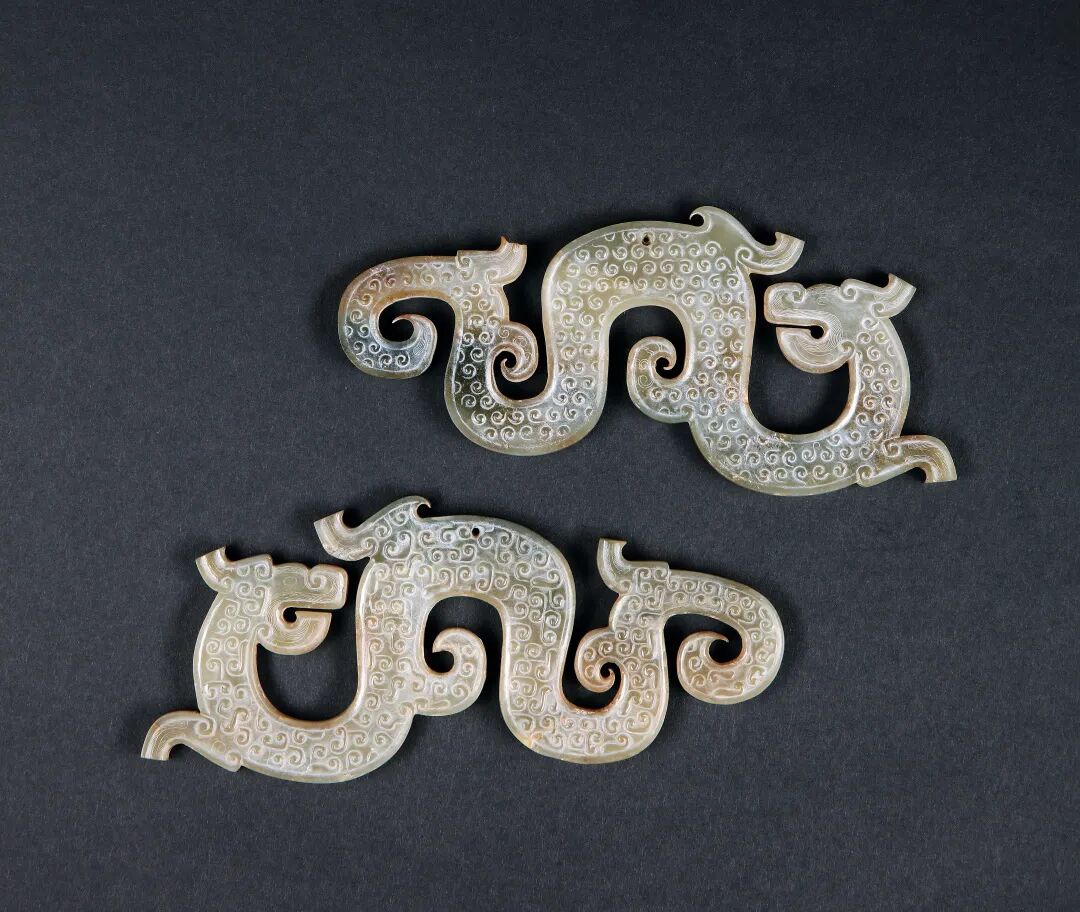 战国 白玉雕螭龙纹佩一对