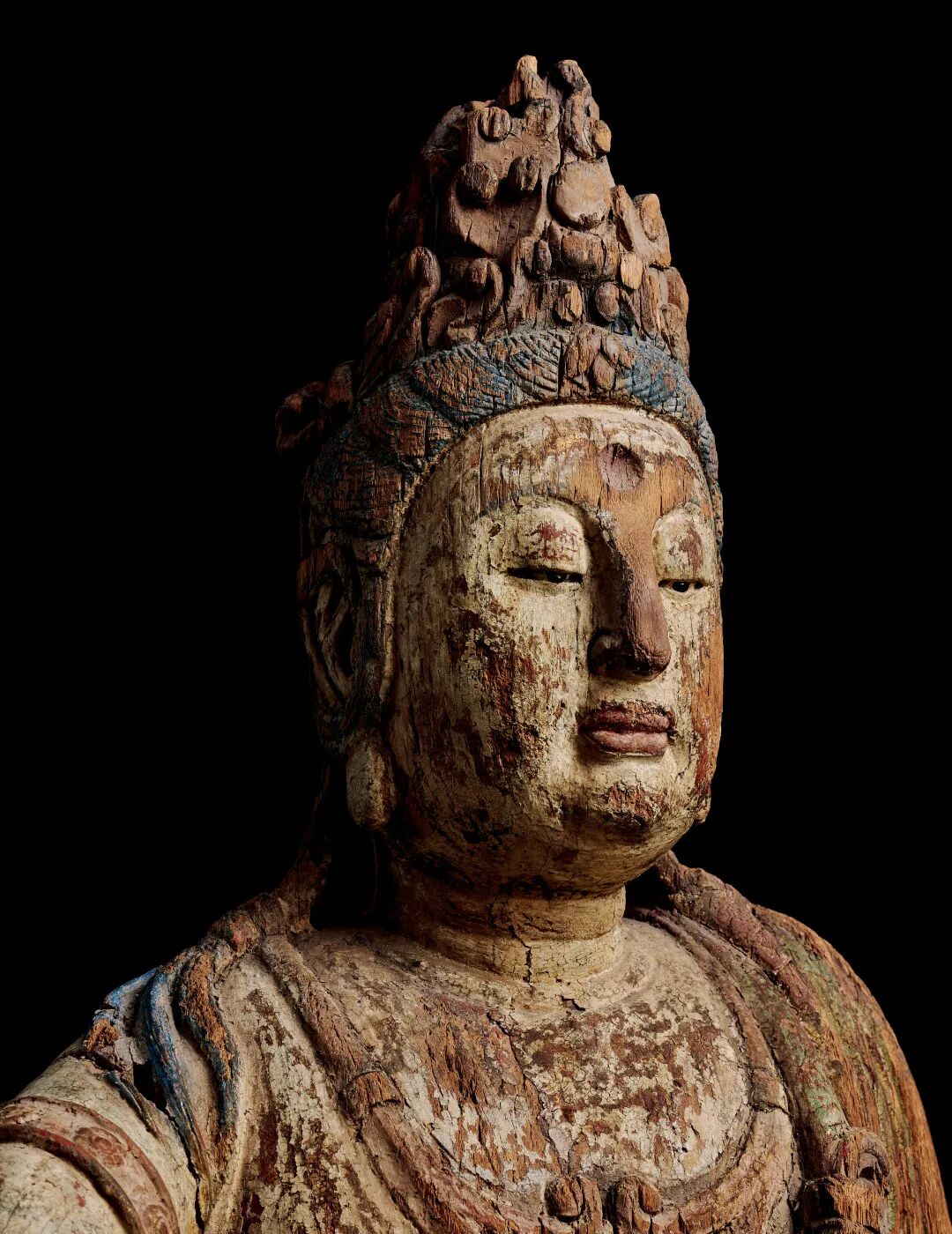 此尊观音具有金元时期造像的浑厚、壮硕之感,顶束高髻,余发编成两股发辫倚肩而下,发丝根根分明。观音躯体健硕,观音面容丰腴圆润,头部微颔,面容祥和,双目微睁,下视芸芸众生。眉心白毫,琉璃眼珠,唇边笑意神秘且极富韵味,非常写实。