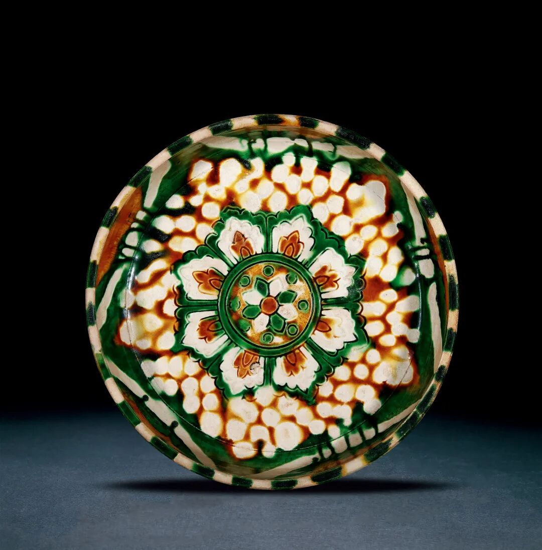 本品三彩宝相花纹盘为盛唐经典之代表。此类纹饰,彩色、作法变化多样,精彩纷呈。本洗宝相花纹,花分八瓣,于陶土尚湿时模印而成,灵感应源自银器,然此纹饰亦见于织品等材质。宝相花纹外饰白点,似与同期金属器珍珠地装饰手法相近。参考一银盖盒例,西安何家村出土,载于《大唐长安展》,京都文化博物馆,京都,1994 年,编号 56。本件唐代三彩宝相花纹洗流传有序,经诸位收藏大家宝藏至今,而品相完好,近尤难得。