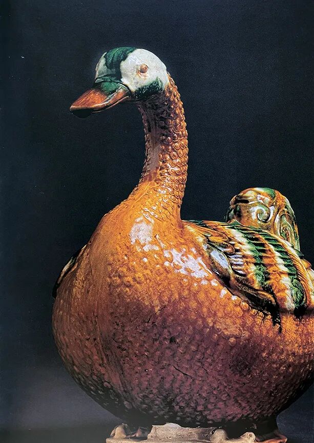 本件三彩鸭曲项昂首,造型端庄大器优美灵动,釉色明亮悦目,釉彩流淌天趣自然,与之形似的完整三彩器似仅有三件。一例为旧金山亚洲艺术博物馆收藏,曾先后属卢芹斋、Avery Brundage。Brundage 1952 – 1972 年任国际奥林匹克运动委员会主席,该博物馆陶瓷多数为其捐赠。见贺利,Chinese Ceramics.The New Standard Guide,伦敦,1996 年,图版 170;又见台北故宫博物院编《中华五千年文物集刊:唐三彩》,台北,1995 年,下卷,图版 159。