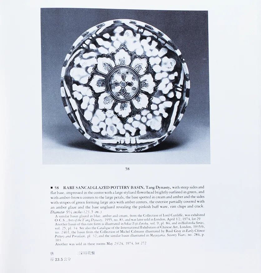 另可比较数例,洗心纹饰相近,无白点,其一现藏伦敦维多利亚和阿尔伯特博物馆,载 Mario Prodan《The Art of the Tang Pottery》,伦敦,1960 年,彩色图版 XVII;另一例现存于洛杉矶郡美术博物馆,洛杉矶,载于《唐三彩釉陶》,香港,1977 年,卷 2,图版 89;再比一例,出自 J. Spaulding 收藏,售于纽约苏富比 1974 年 5 月 23 至 24 日,编号 272。