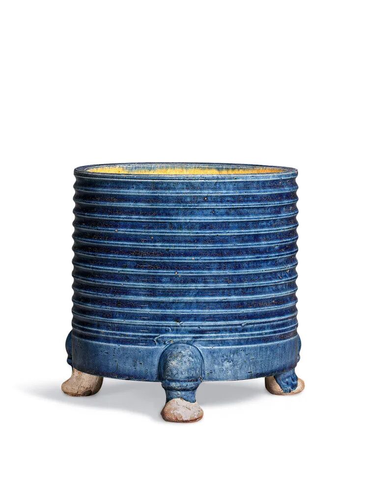 唐 蓝釉弦纹三足罐