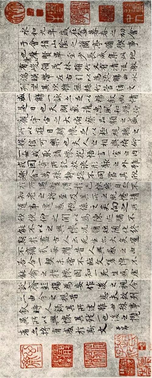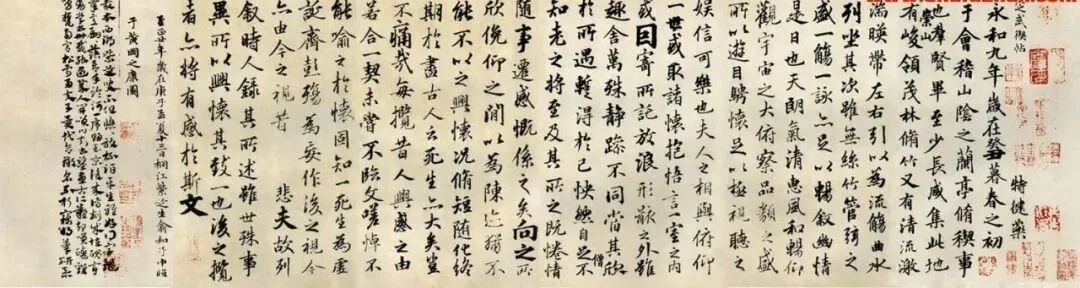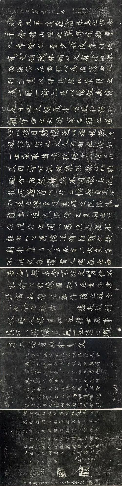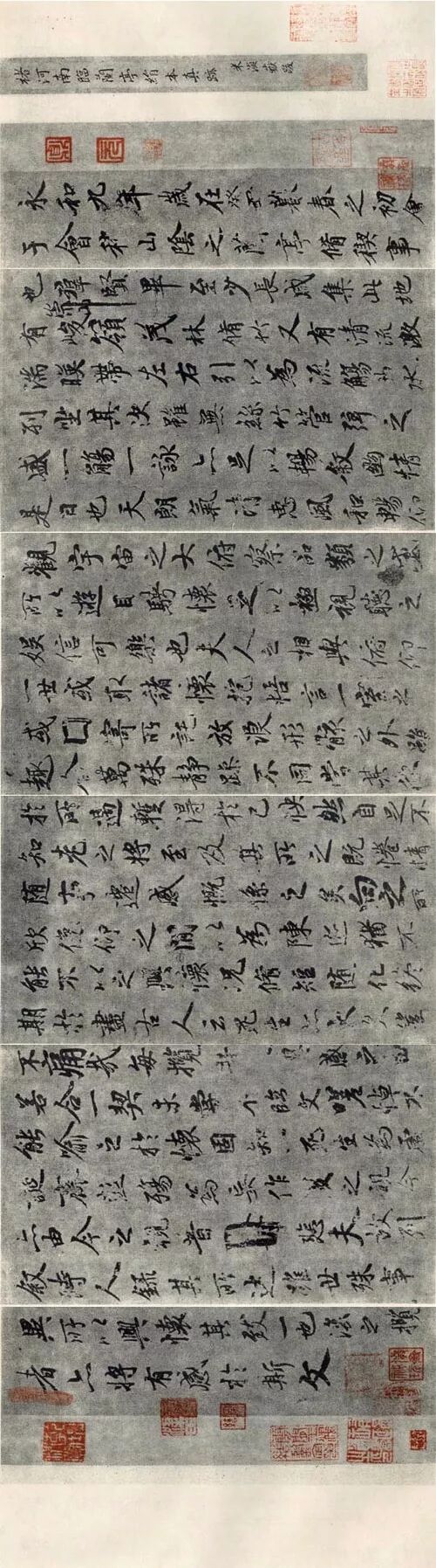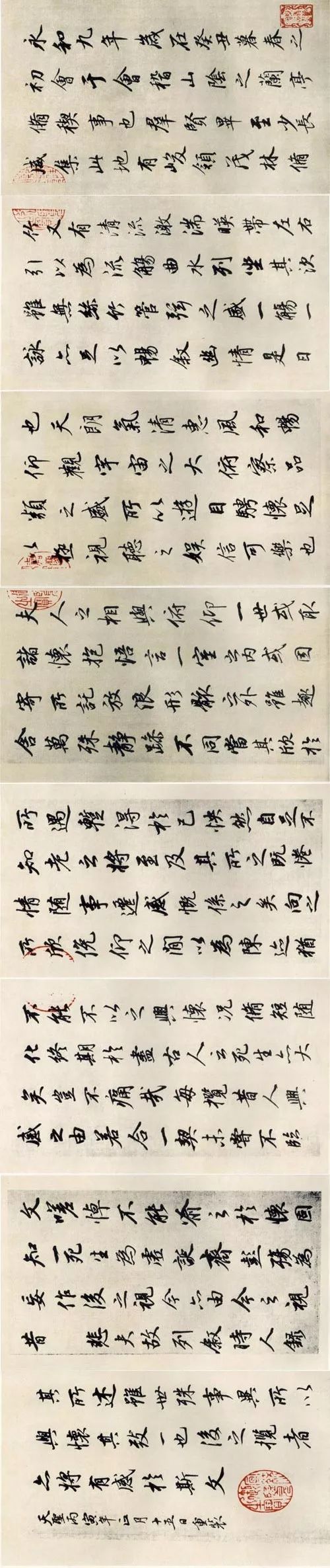 因此,历代书家都推《兰亭序》为“天下第一行书”。存世唐摹墨迹以“神龙本”为最著,唐太宗时冯承素号金印,故称为《兰亭神龙本》,此本摹写精细,笔法、墨气、行款、神韵,都得以体现,公认为是最好的摹本;石刻首推“定武本”。经郭沫若考证,以为相传的《兰亭序》后半文字,兴感无端,与王羲之思想无相同之处,书体亦和近年出土的东晋王氏墓志不类,疑为隋唐人所伪托。但也有不同意其说者。