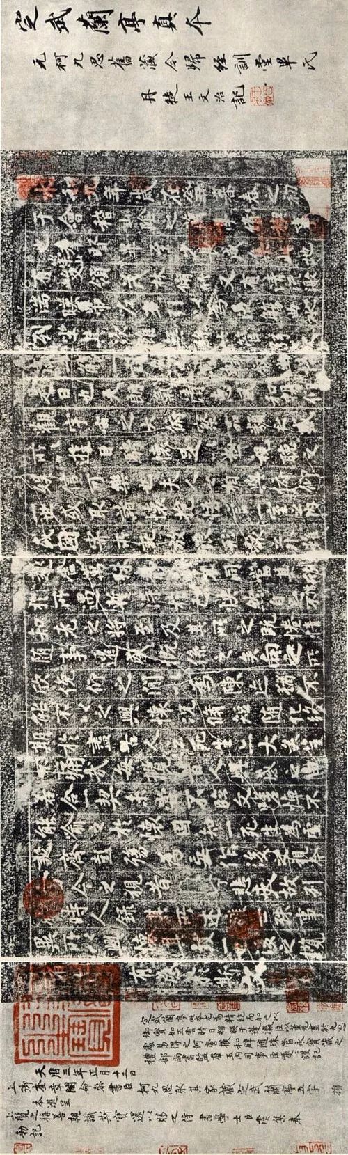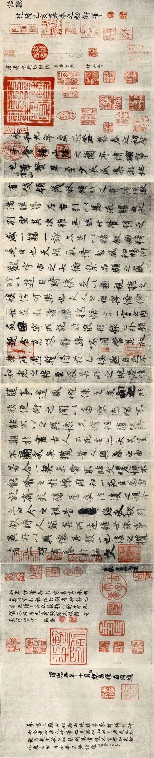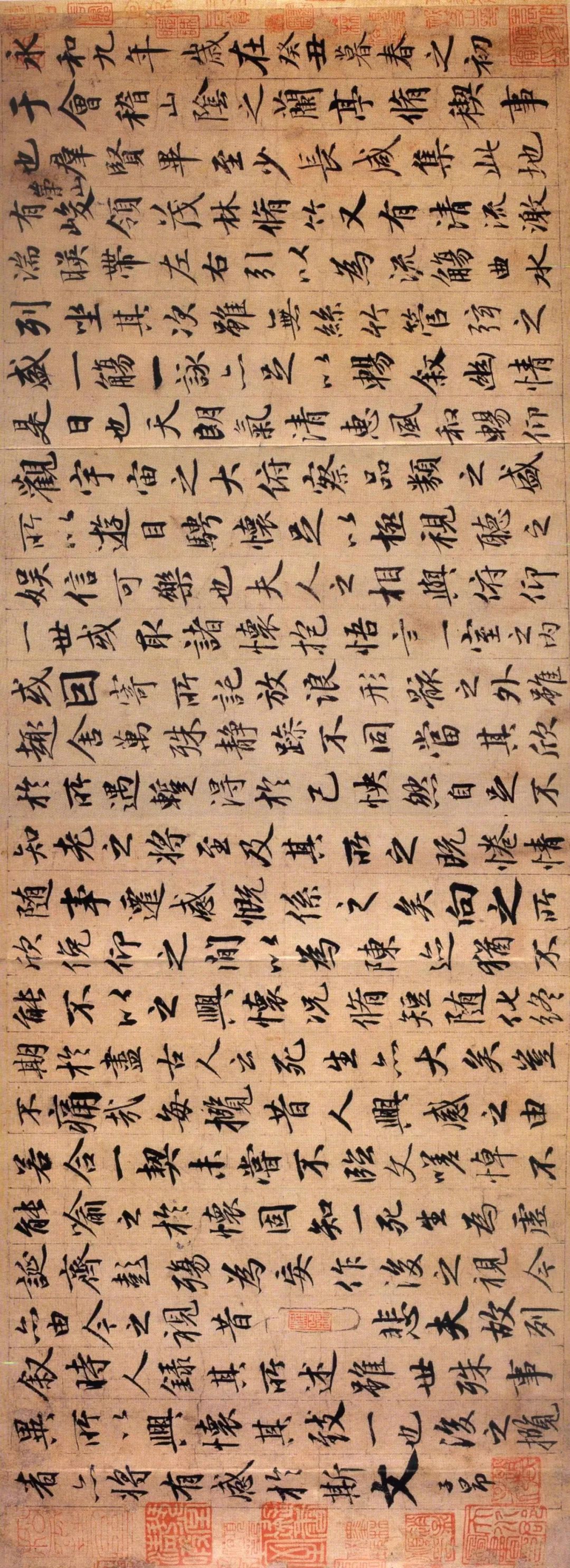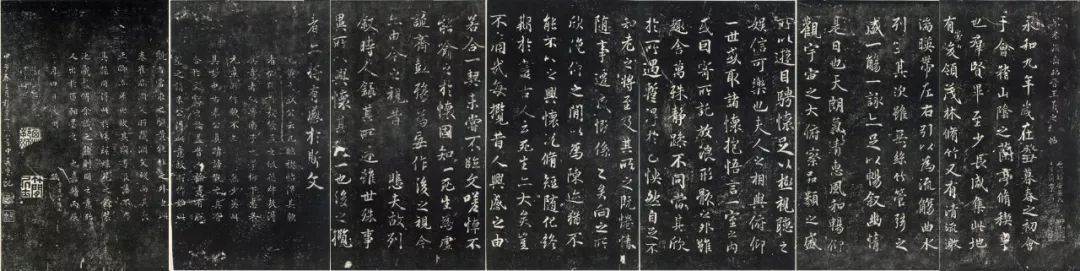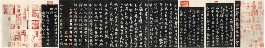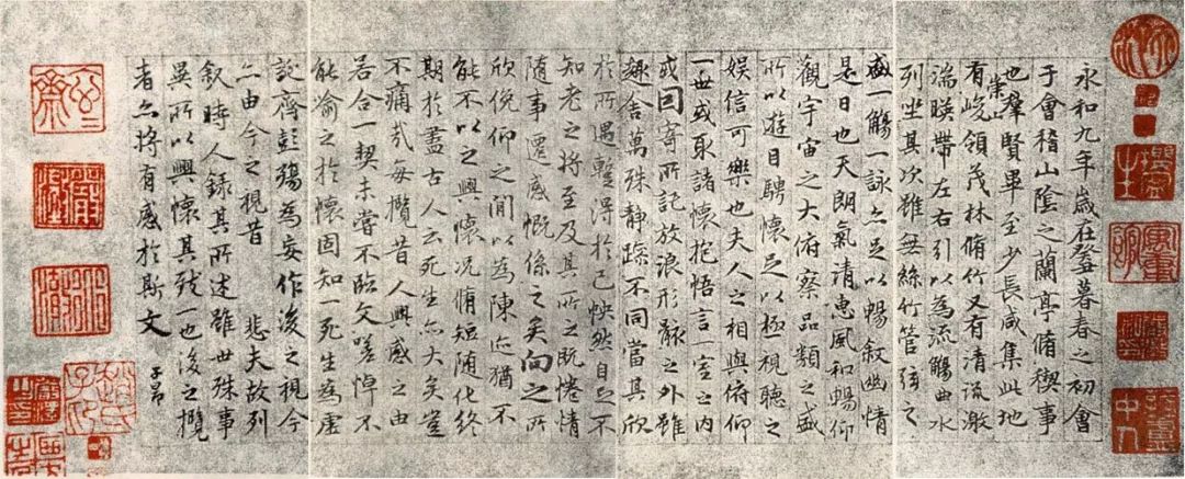 因此,历代书家都推《兰亭序》为“天下第一行书”。存世唐摹墨迹以“神龙本”为最著,唐太宗时冯承素号金印,故称为《兰亭神龙本》,此本摹写精细,笔法、墨气、行款、神韵,都得以体现,公认为是最好的摹本;石刻首推“定武本”。经郭沫若考证,以为相传的《兰亭序》后半文字,兴感无端,与王羲之思想无相同之处,书体亦和近年出土的东晋王氏墓志不类,疑为隋唐人所伪托。但也有不同意其说者。