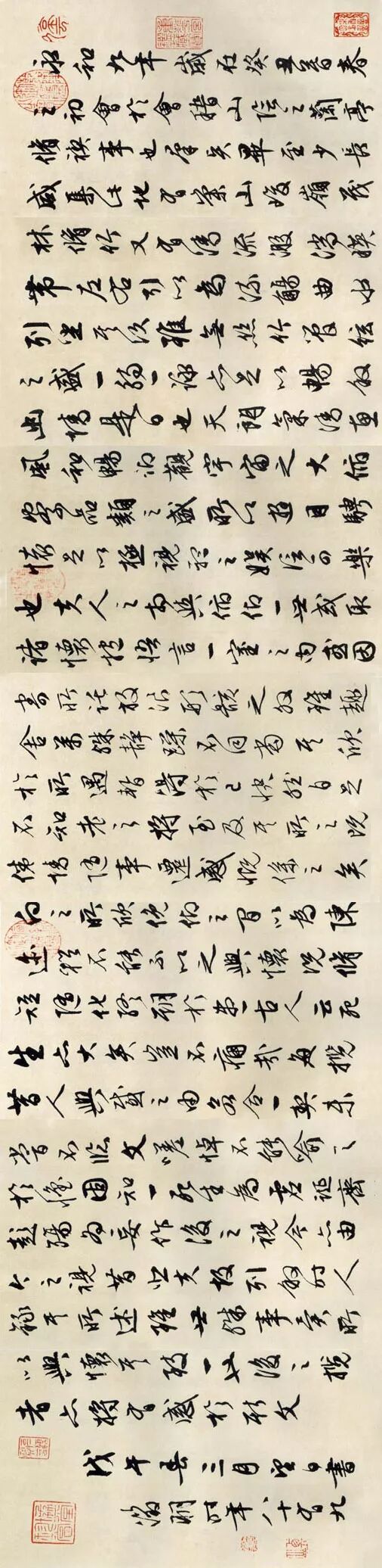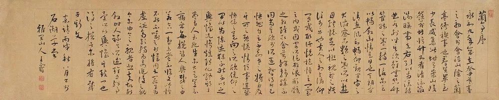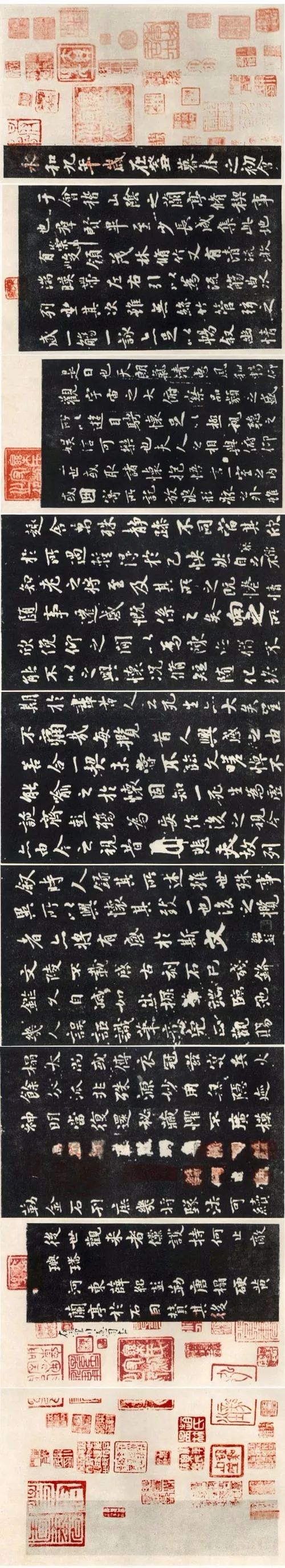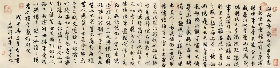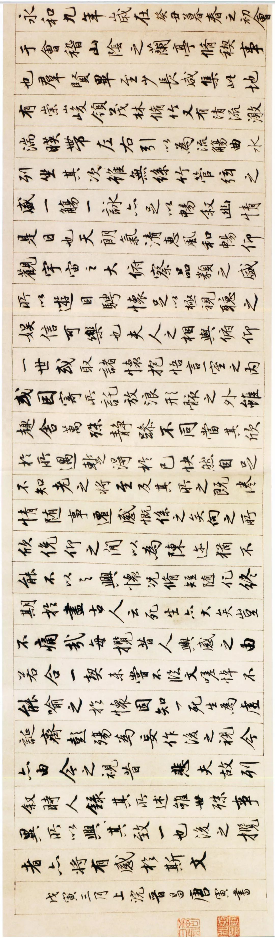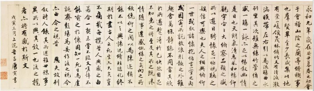 因此,历代书家都推《兰亭序》为“天下第一行书”。存世唐摹墨迹以“神龙本”为最著,唐太宗时冯承素号金印,故称为《兰亭神龙本》,此本摹写精细,笔法、墨气、行款、神韵,都得以体现,公认为是最好的摹本;石刻首推“定武本”。经郭沫若考证,以为相传的《兰亭序》后半文字,兴感无端,与王羲之思想无相同之处,书体亦和近年出土的东晋王氏墓志不类,疑为隋唐人所伪托。但也有不同意其说者。
