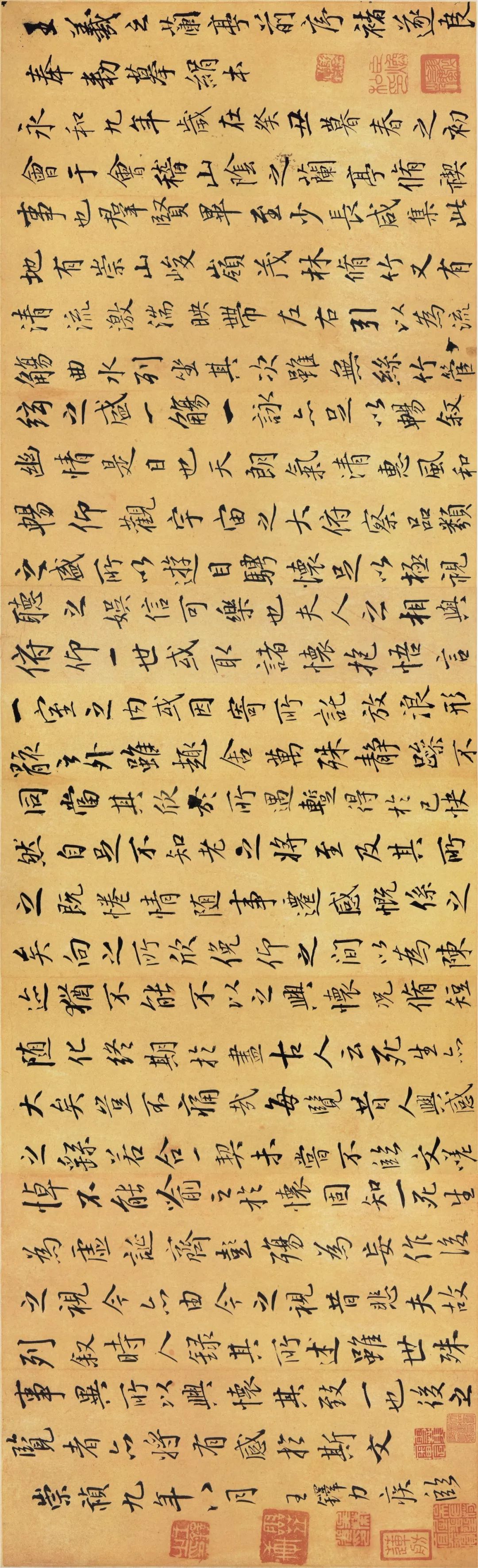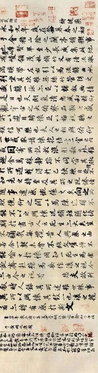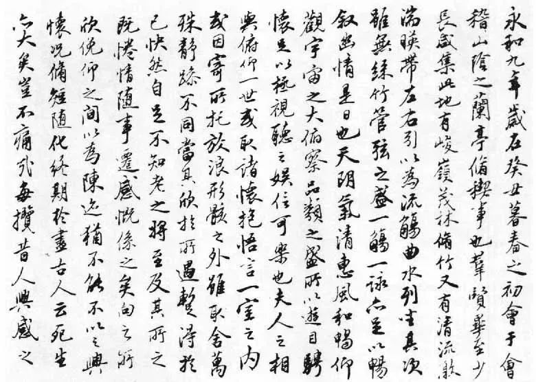 序中记叙兰亭周围山水之美和聚会的欢乐之情,抒发作者好景不长,生死无常的感慨。法帖相传之本,共二十八行,三百二十四字,章法、结构、笔法都很完美,是他五十岁时的得意之作。后人评道“右军字体,古法一变。其雄秀之气,出于天然,故古今以为师法”。