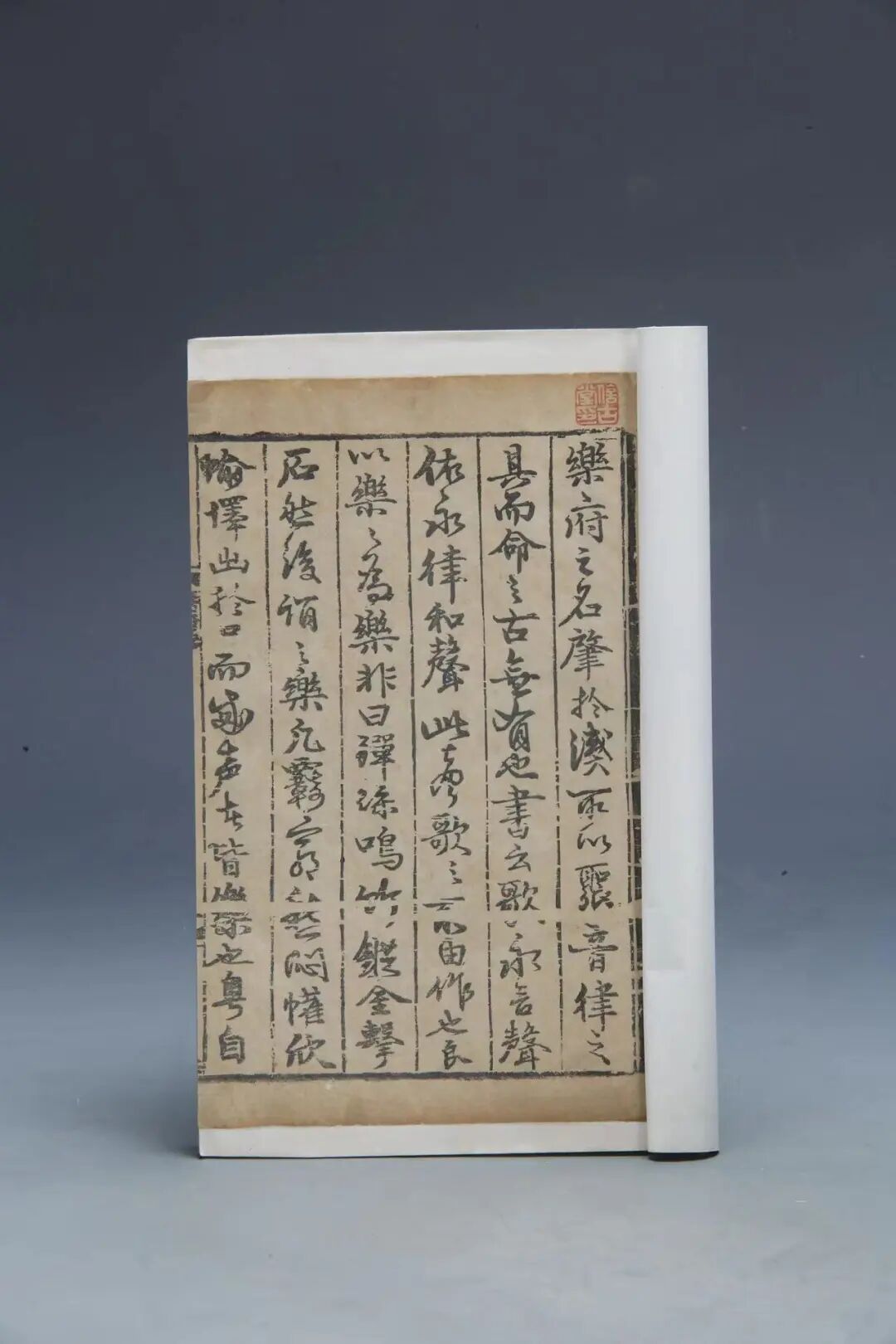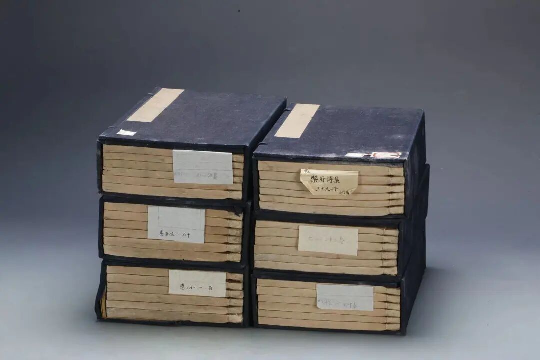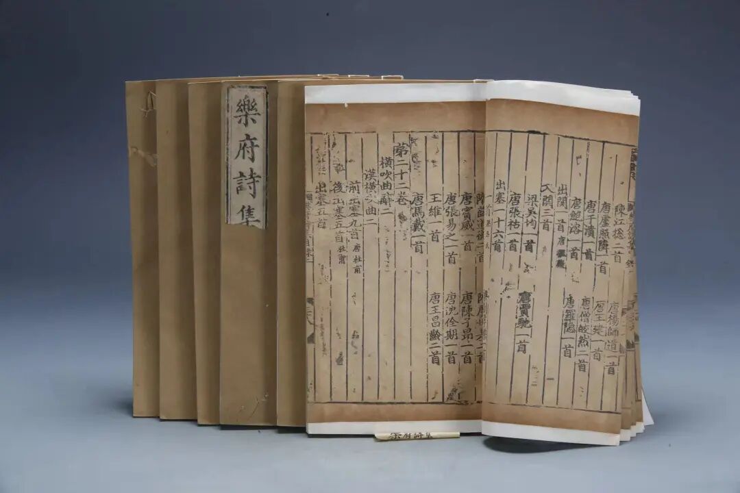 杭州博物馆藏《乐府诗集》一百卷目录二卷,元至正元年(1341)集庆路儒学刻明修本,明代补刊叶版心上方镌有“嘉靖三十年补”字样,第九十六至一百卷为清代补抄。三十六册,每半叶十一行,行二十字,左右双边,白口,三鱼尾两上一下。每册首页钤“信古堂印”,金镶玉装帧。入选《国家珍贵古籍名录》第二批。