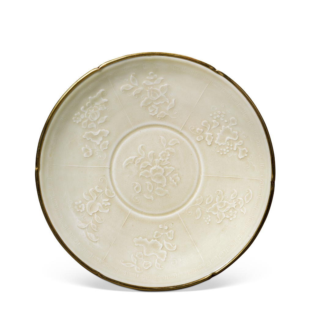 定窑白釉模印分格折枝花果纹花口盘