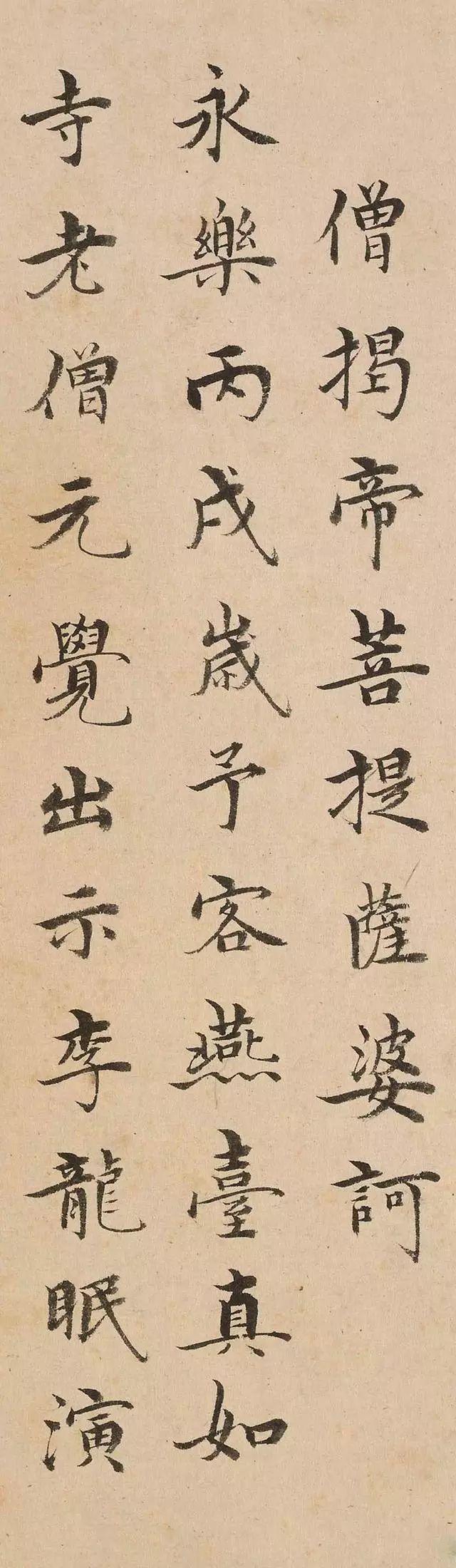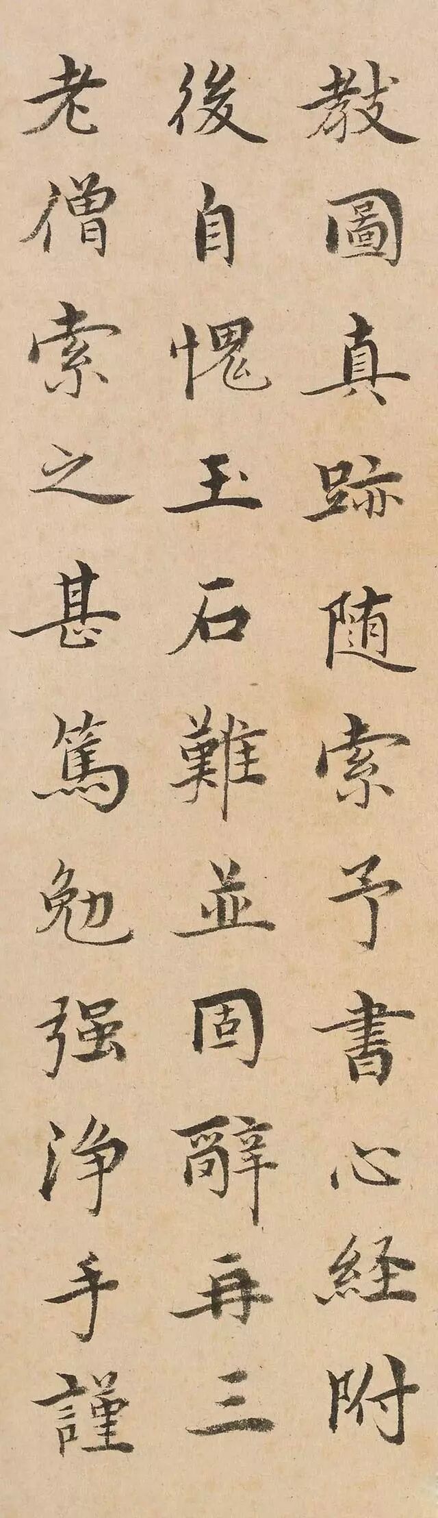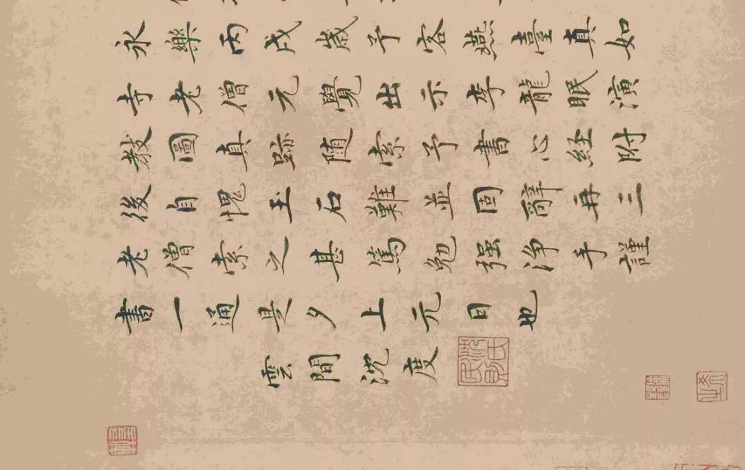 1406年,沈度客燕台真如寺,应老僧元觉之请书《心经》附于李龙眠《演教图》之后。此册小楷《心经》,亦称题李公麟《维摩诘演教图》,为沈度49岁时所书,姿态婉丽、乎和简静,为沈度小楷书中之精品。