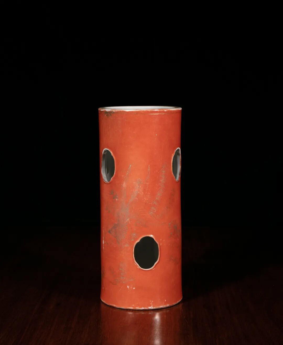 清道光 珊瑚釉描金鱼藻纹帽筒