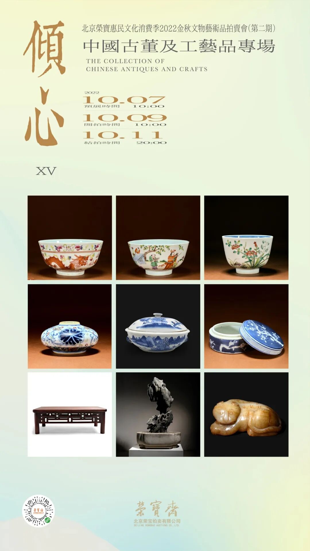 北京荣宝惠民文化消费季2022金秋文物艺术品拍卖会(第二期)——倾心(XV)中国古董及工艺品专场将于10月7日10:00-10月9日10:00开启线上预展,并于10月9日10:00开拍,10月11日20:00结拍。