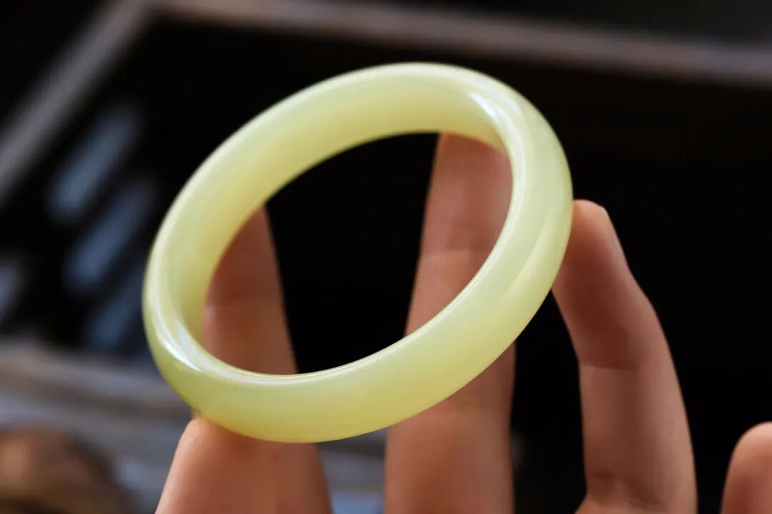市场上说,黄口是最接近黄玉的料种。它是和田玉山料的一种,最初玉料的基质是白玉,外界矿物元素在大自然的作用下,经过氧化慢慢渗入玉肉内,发展成了偏绿色或青色的黄色调。